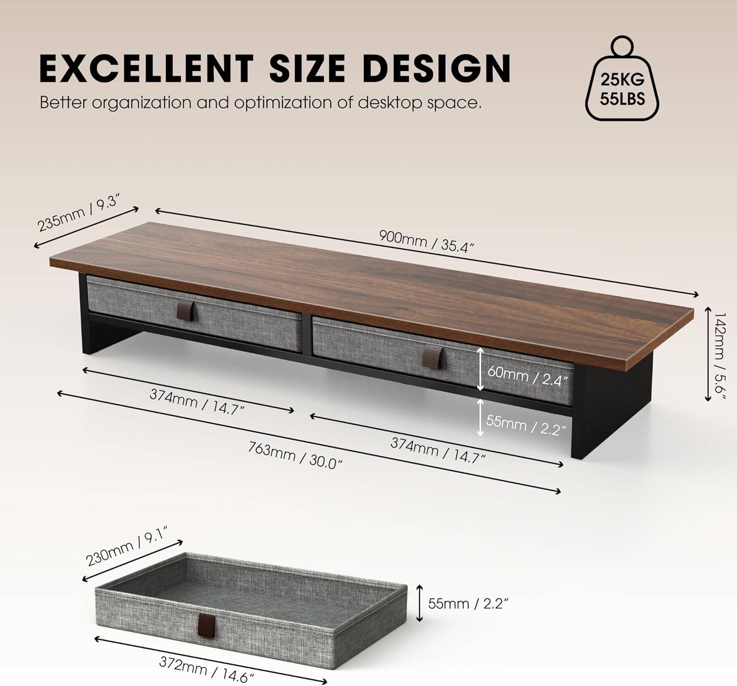 - 【Extra Large Workstation】Equipped with 2 fabric drawers, this monitor stand effortlessly organizes cables, stationery, or office supplies, maximizing desk space while protecting privacy. The 2-tiers structure (35"x9.3") securely holds dual monitors, printers, or TVs, transforming cluttered desks into streamlined workstations.
