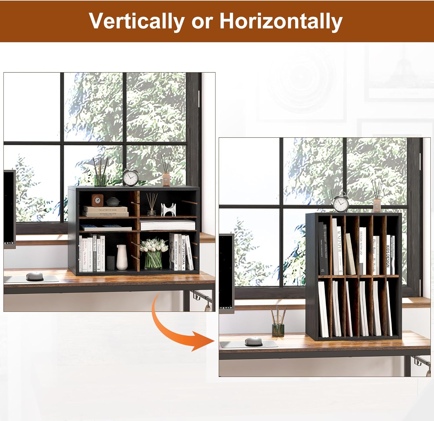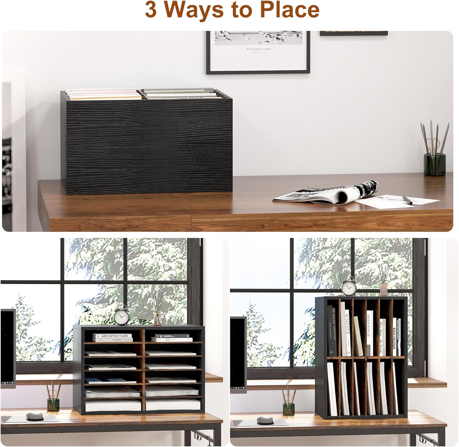 Mail Organizer Countertop, 12 Slots Wooden Desk File Literature Sorter, Adjustable Paper Storage Shelves Document Holder, Space Saving Desktop Mailbox for Office Classroom, Black/Rustic Brown