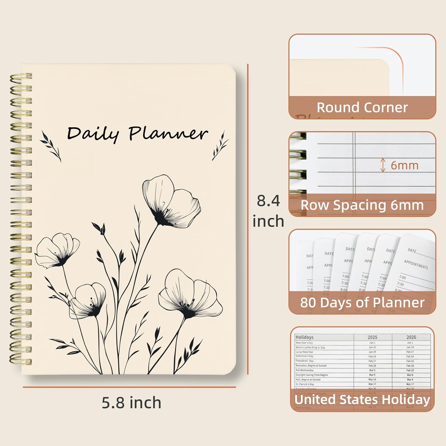 Stanoha Undated Daily Planner - Spiral Notebook 80 Days One Day Per Page, Hourly Schedule, To-Do List, Notes, Everyday Planning Task, A5 Hardcover Journal Organizer Book Women Cute, White Flower