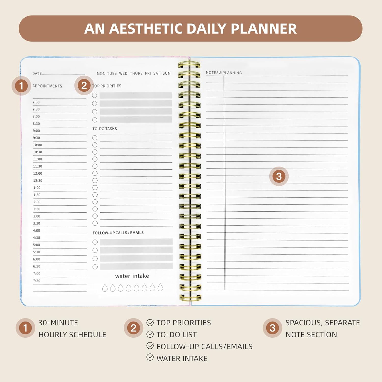 Undated Daily Planner - Spiral Notebook 80 Days One Day Per Page, Hourly Schedule, To-Do List, Notes, Everyday Planning Task, A5 Hardcover Journal Organizer Book Women Cute Aesthetic, Winter