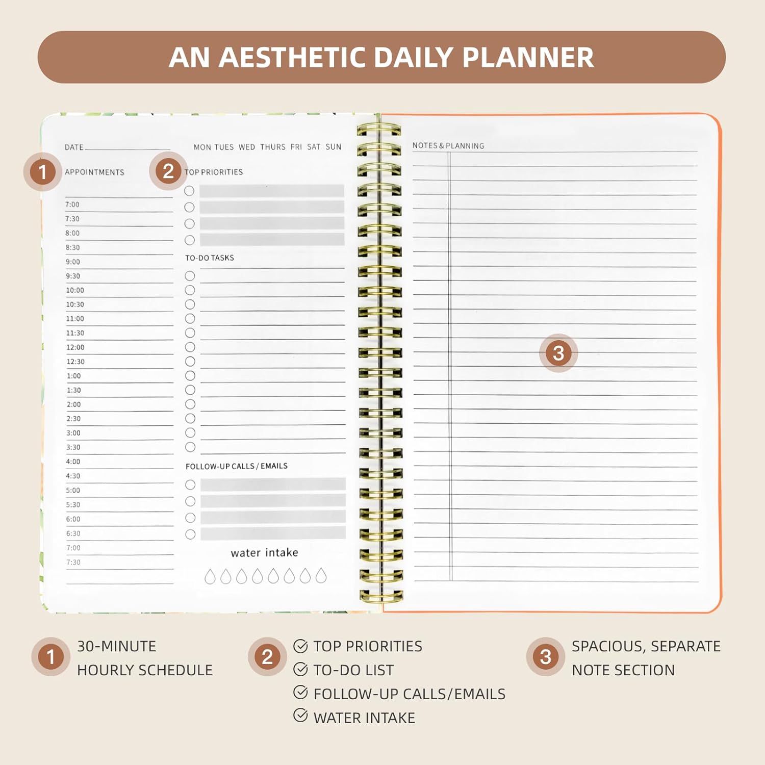 Undated Daily Planner - Spiral Notebook 80 Days One Day Per Page, Hourly Schedule, To-Do List, Notes, Everyday Planning Task, A5 Hardcover Journal Organizer Book Women Cute Aesthetic, Summer