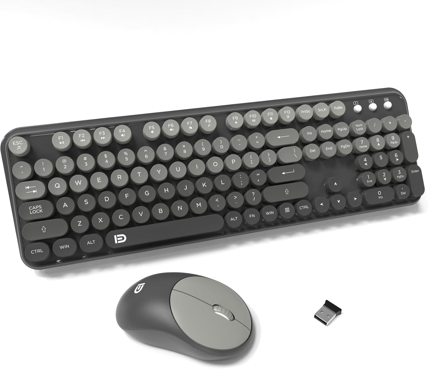FD Wireless Keyboard and Mouse Combo - 2.4G Full-Sized Cute Colorful Mouse and Keyboard with 104 Round Keys Retro Typewriter Keyboards for Laptop/Windows/PC - Grey Gradient