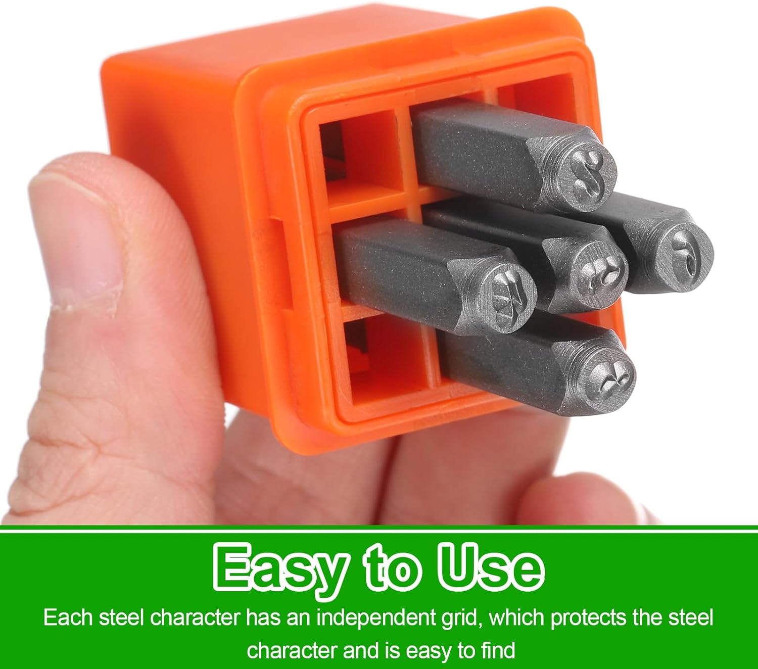 - Size - Letters: 6x6mm / 0.24x0.24 inch (LxW); Steel bars: 64x8x8mmmm / 2.5x0.32x0.32 inch (LxWxH); Package includes: 36 x metal punch stamps (26 uppercase letters from A to Z, numbers from 0 to 8, an '&' symbol, the "6" stamp can be used as a "9")