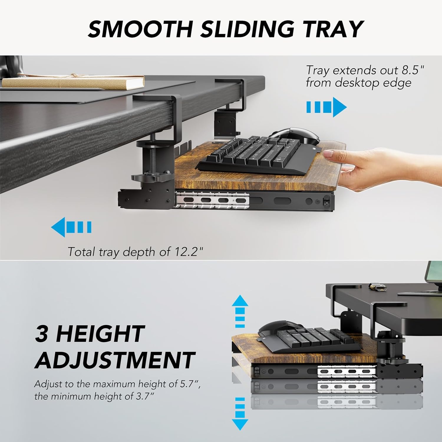 - Comfortable Typing Angles - Easily slide the tray in and out and enjoy ergonomic typing angles that relieve stress on your wrists and shoulders. The tray extends a maximum of 5.7” from the edge of your desk
