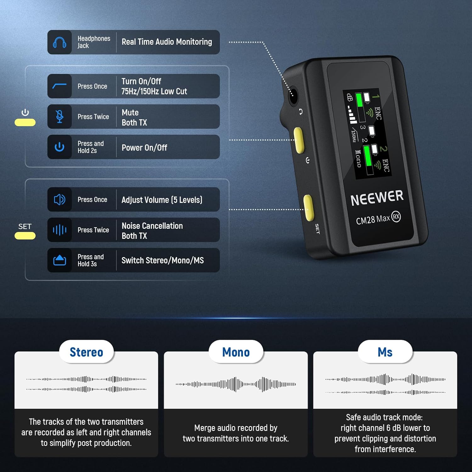 - 【1 Click Noise Cancellation & Mute】 On RX: Double press the power button to activate mute function; single press the SET button to adjust the output volume from level 1 to 5; double press the SET button to activate noise cancellation function. On TX: Single press the power button to independently adjust the microphone input gain control in 5 levels