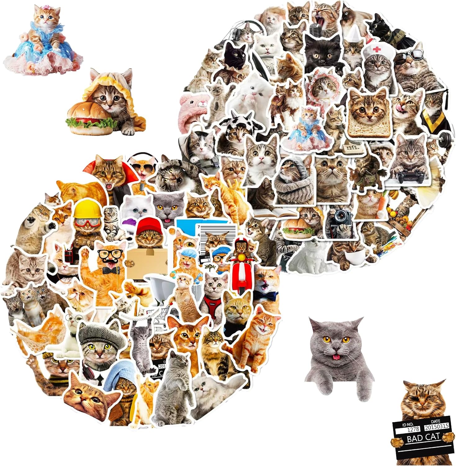 - Funny Cat Stickers:Each Pack Includes 100 Pcs Funny Cat Stickers, two different styles of realistic cats,Different sizes,Beautiful Designs.