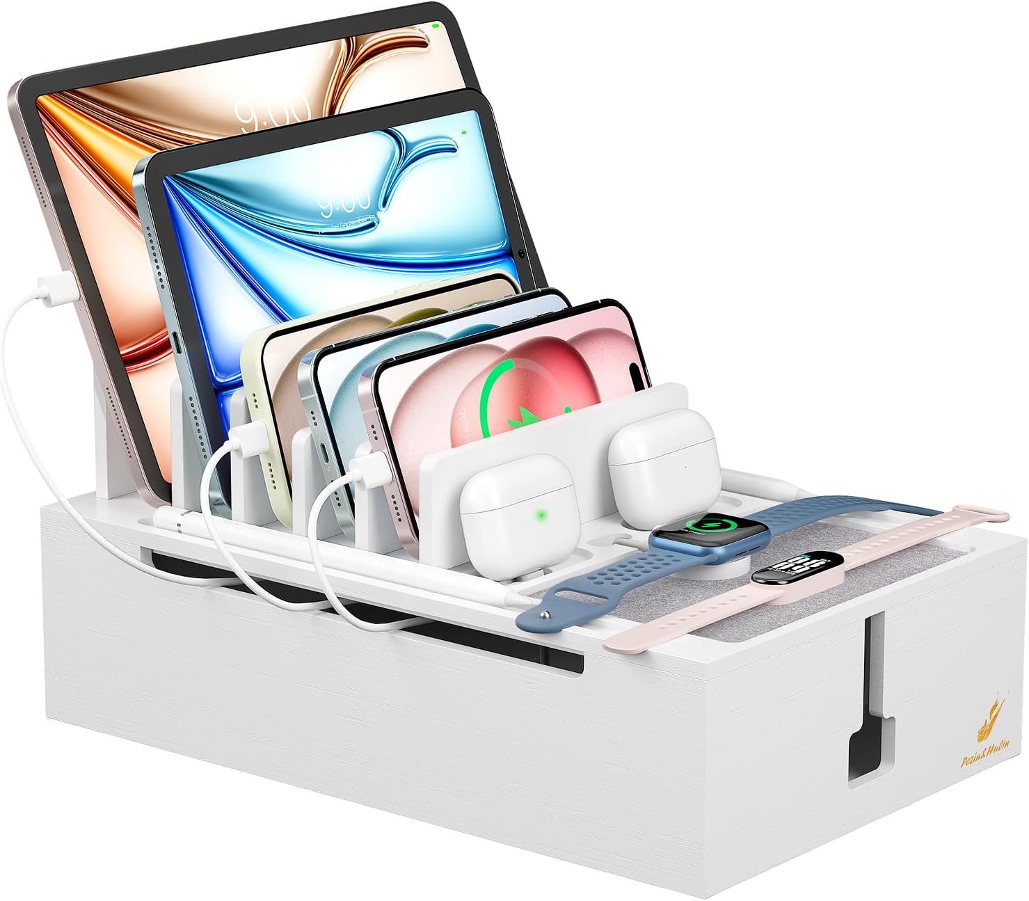 - Creative Design: Our Charging Station designed with a wide flat tray with felt pad not only aesthetic, but also can prevent your items from being scratched. Spacious 6 baffles can hold your phones, tablets or game consoles no matter how thick case on. 4 special grooves can organize your earbuds and stylus pens (Each part is designed with data cable holes for easy