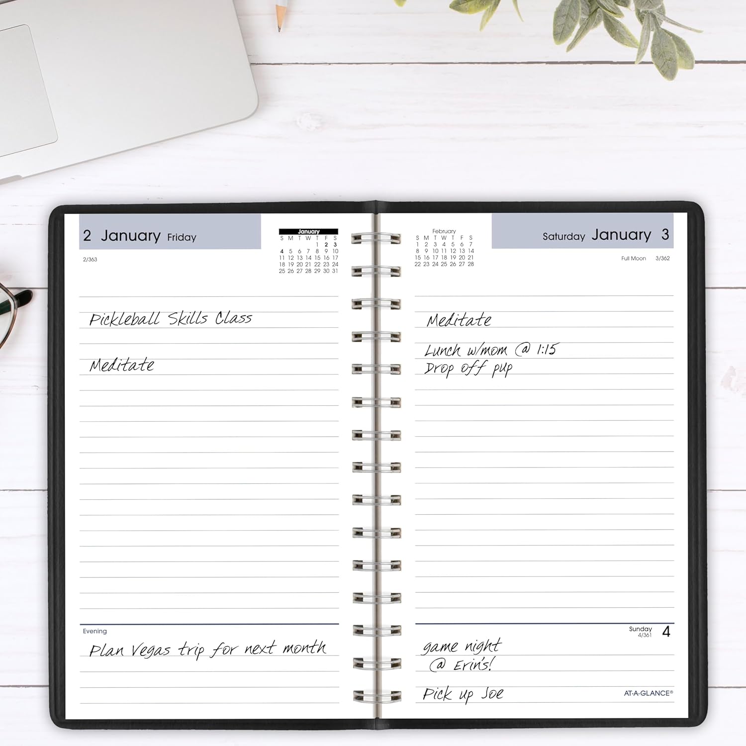 - DAILY VIEWS – One page per day format with ruled daily planning sections Monday — Saturday with reference calendars and a section for notes. Weekends share a page and Sundays are condensed and untimed. Pages measure 5" x 8".