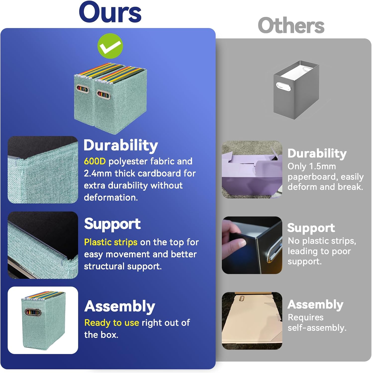 - Easy to Assemble: Simply unfold the organizer, insert the thickened bottom panel, and it's ready to use in just 10 seconds. When not in use, it can be folded flat to save space. The open-top design allows for quick and easy access to your files, improving efficiency