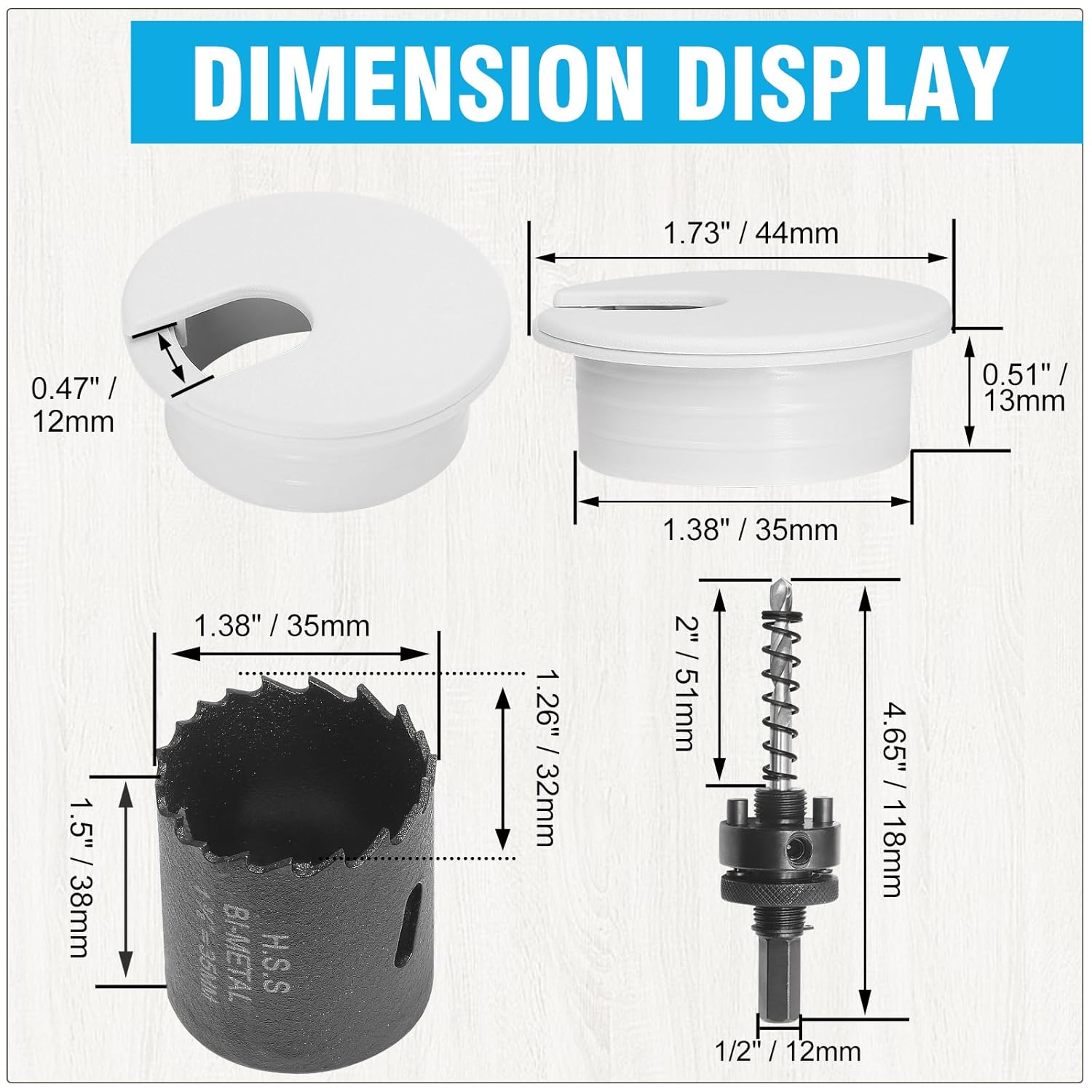 - DELIGHTS PACKAGE -- Your package includes 12 x 1-3/8" desk grommets, 1 x 1-3/8" hole saw. Useful Tips: 1.Start by vertically and slowly cutting a slot, 2.Maintain even pressure while cutting, and keep your pace slow to avoid damaging the surface, 3.Periodically clean the desk grommet area to prevent accumulation of debris.
