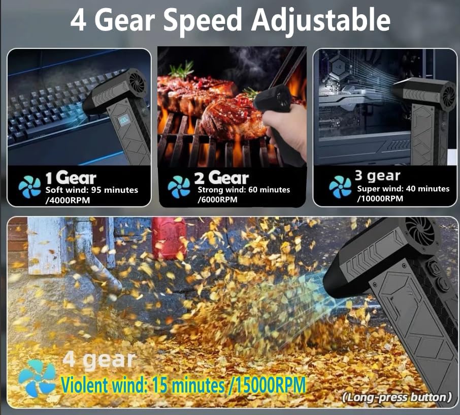 - Super-Power Turbo Fan: This compressed air duster boasts a maximum speed of 130,000 RPM, delivering air pressure up to 180G and wind speeds exceeding 80 m/s. The ultra-high-speed turbo motor ensures exceptional performance and powerful airflow, allowing you to clean with maximum efficiency. This versatile tool perfect for a wide range of tasks, like daily dusting, drying, removing car water, and even snow clearing, offering strong, practical performance for all your cleaning needs