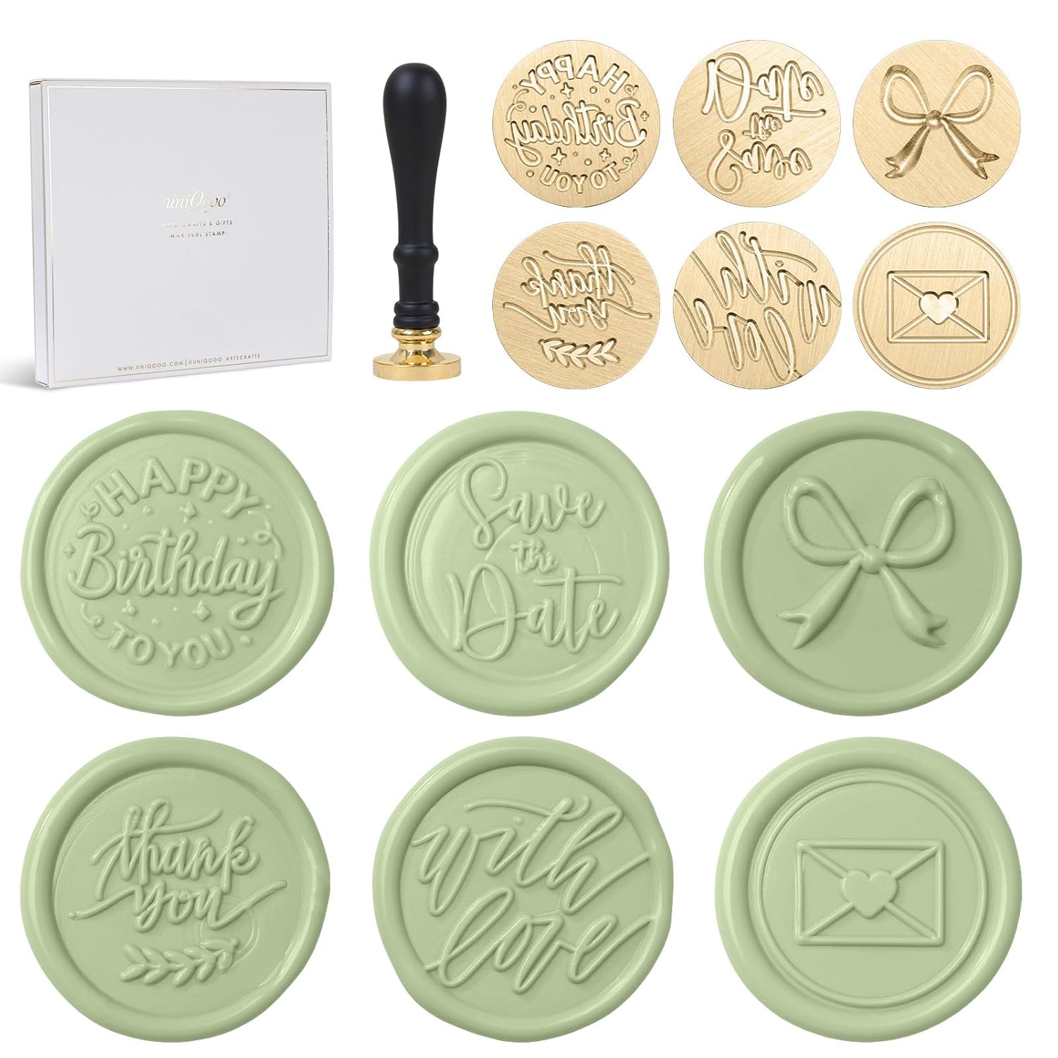 - Package Includes: You will get 1 wooden handle and 6 different shapes wax seal stamp(bow, save the date, thank you, envelop with heart, with love, happy birthday). Different retro classic designs on the stamp can be easily applied to many occasions.size about 0.98in/2.5cm in a diameter.(wax is not included)