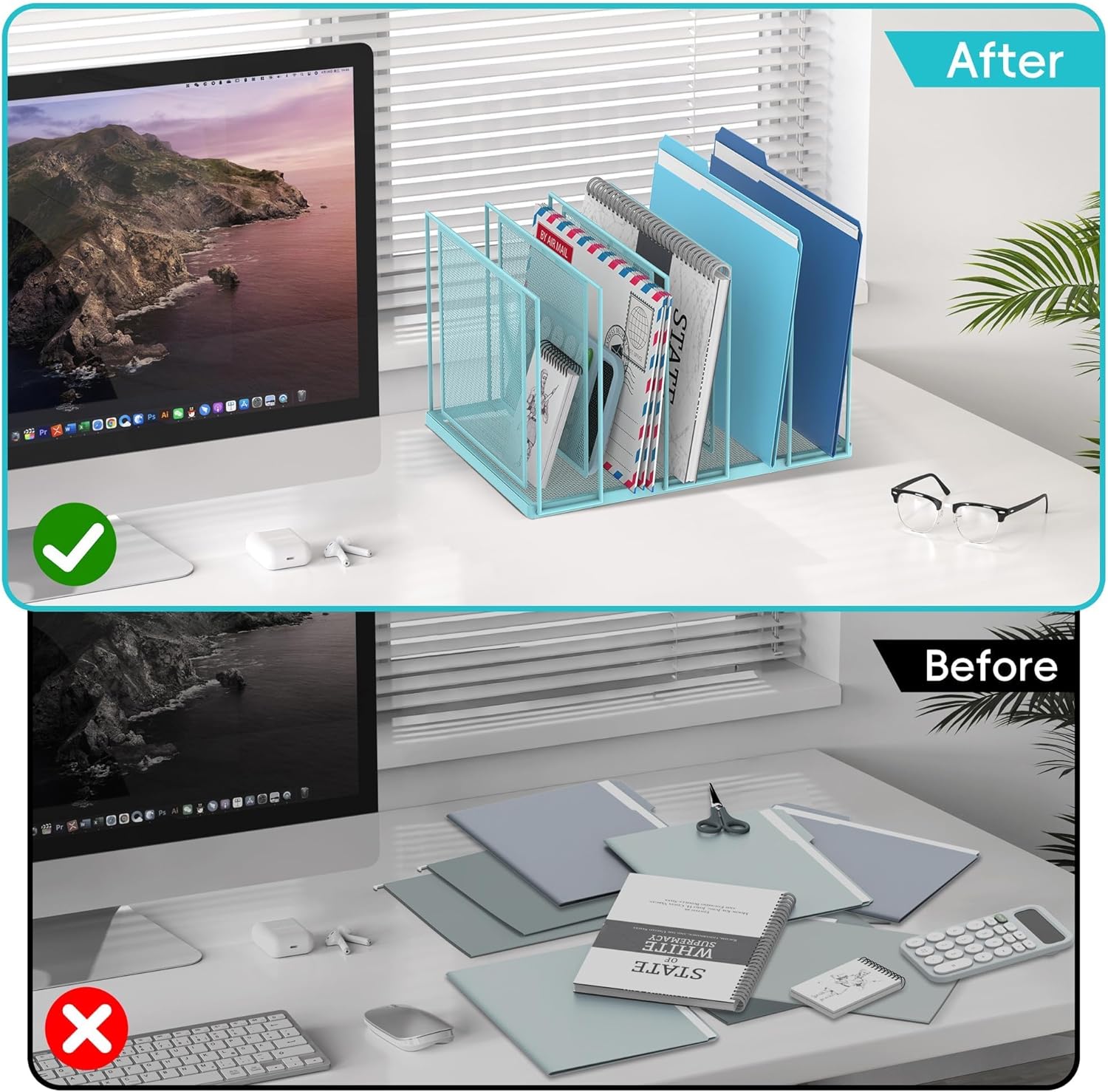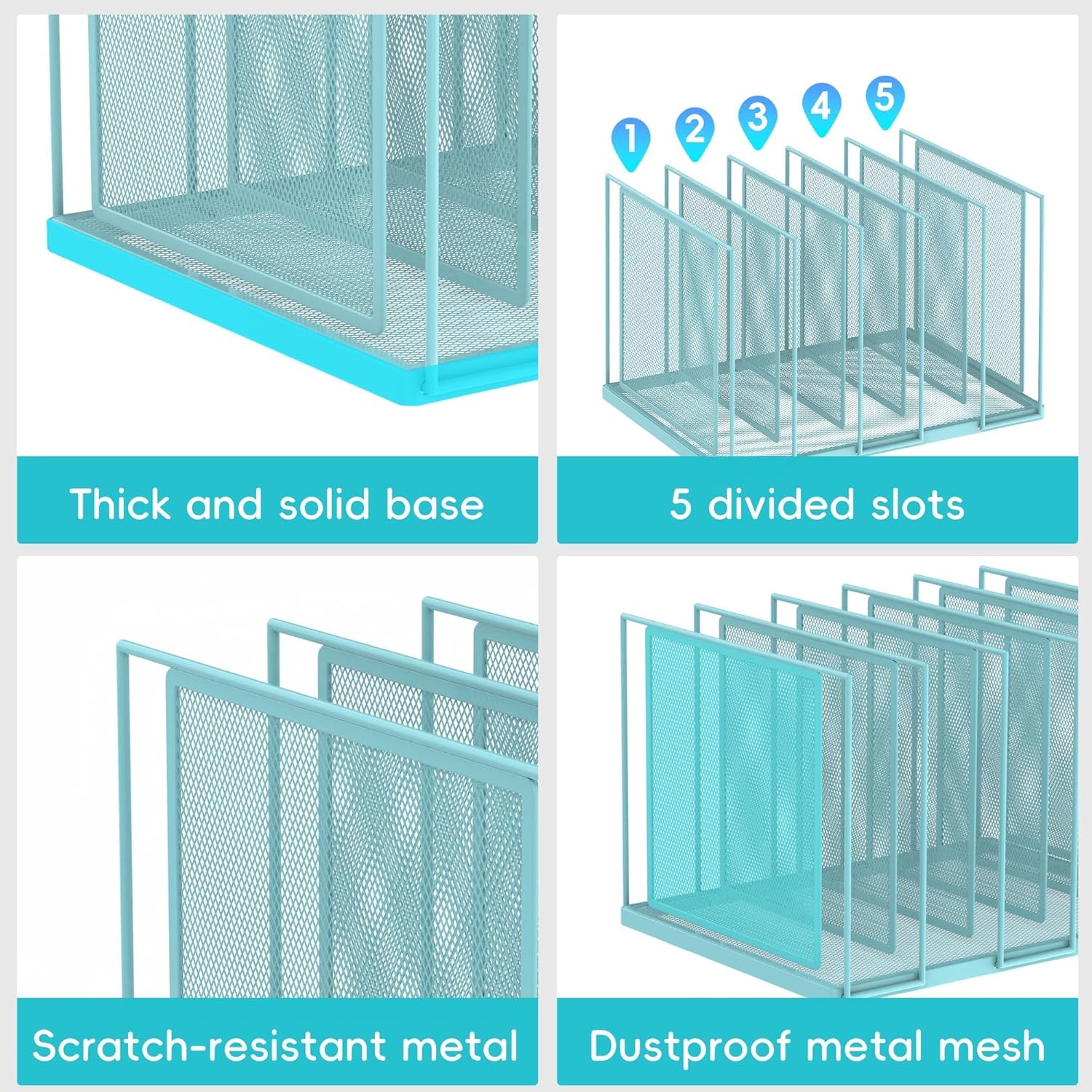 - [High Quality & Durability] The sturdy metal frame and durable steel mesh provide support and stability no matter how many items you put on this vertical file holder. The high-quality powder coat helps resist chipping or scratching, protect your desktop while still beautiful.