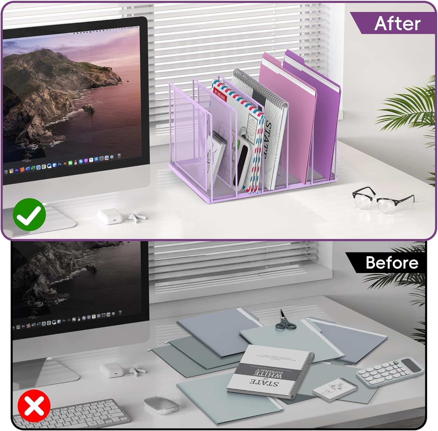 - [High Quality & Durability] The sturdy metal frame and durable steel mesh provide support and stability no matter how many items you put on this vertical file holder. The high-quality powder coat helps resist chipping or scratching, protect your desktop while still beautiful.