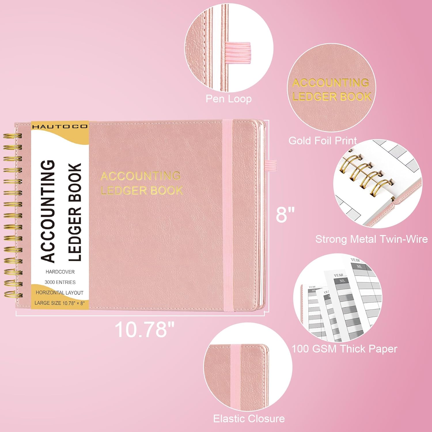 HAUTOCO Hardcover Accounting Ledger Book for Small Business Bookkeeping Horizontal Money Expense Tracker Notebook with 2 Storage Pouch, Personal Columnar Log Journal 10.78 x 8'', Rose Gold