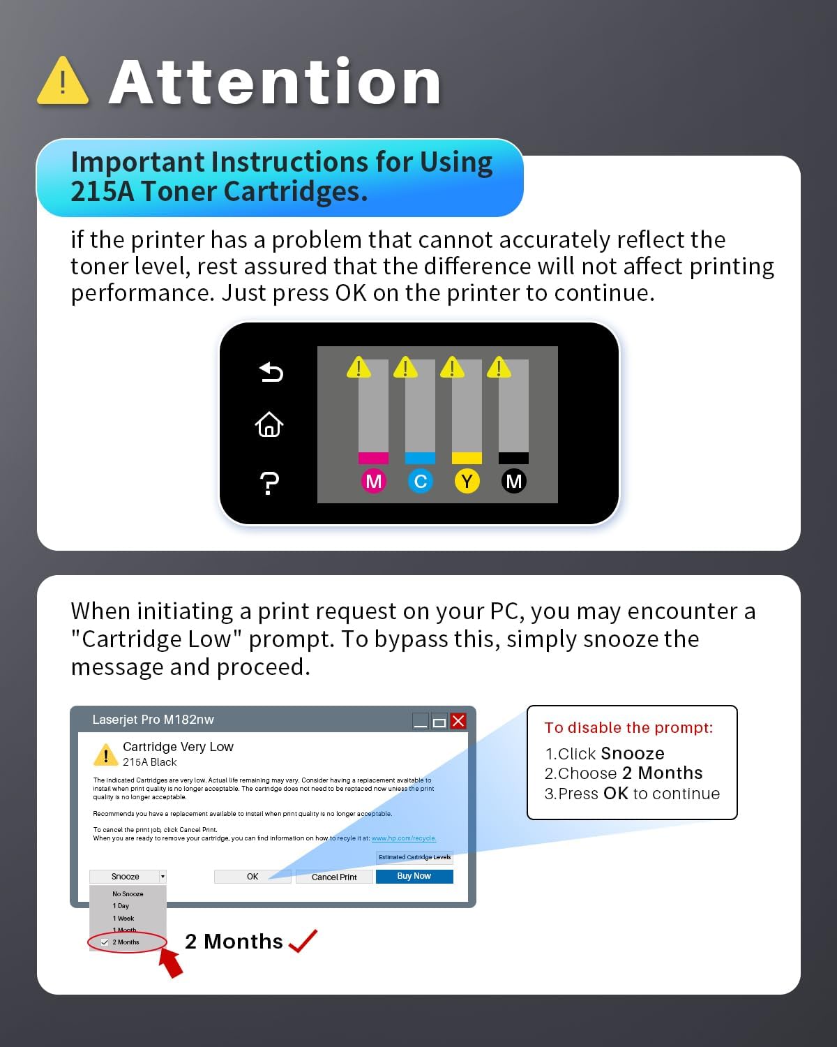- 4. Cartridge Yield (approx.): Up to 1,050 pages per 215A Black, up to 850 pages per 215A Color (5% coverage of A4 paper)