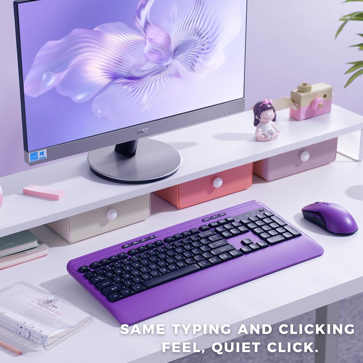 - Silent Keyboard and Mouse: Ultra-quiet typing with soft-touch keys, 90% noise reduction. Ergonomic mouse for smooth, silent clicks.
