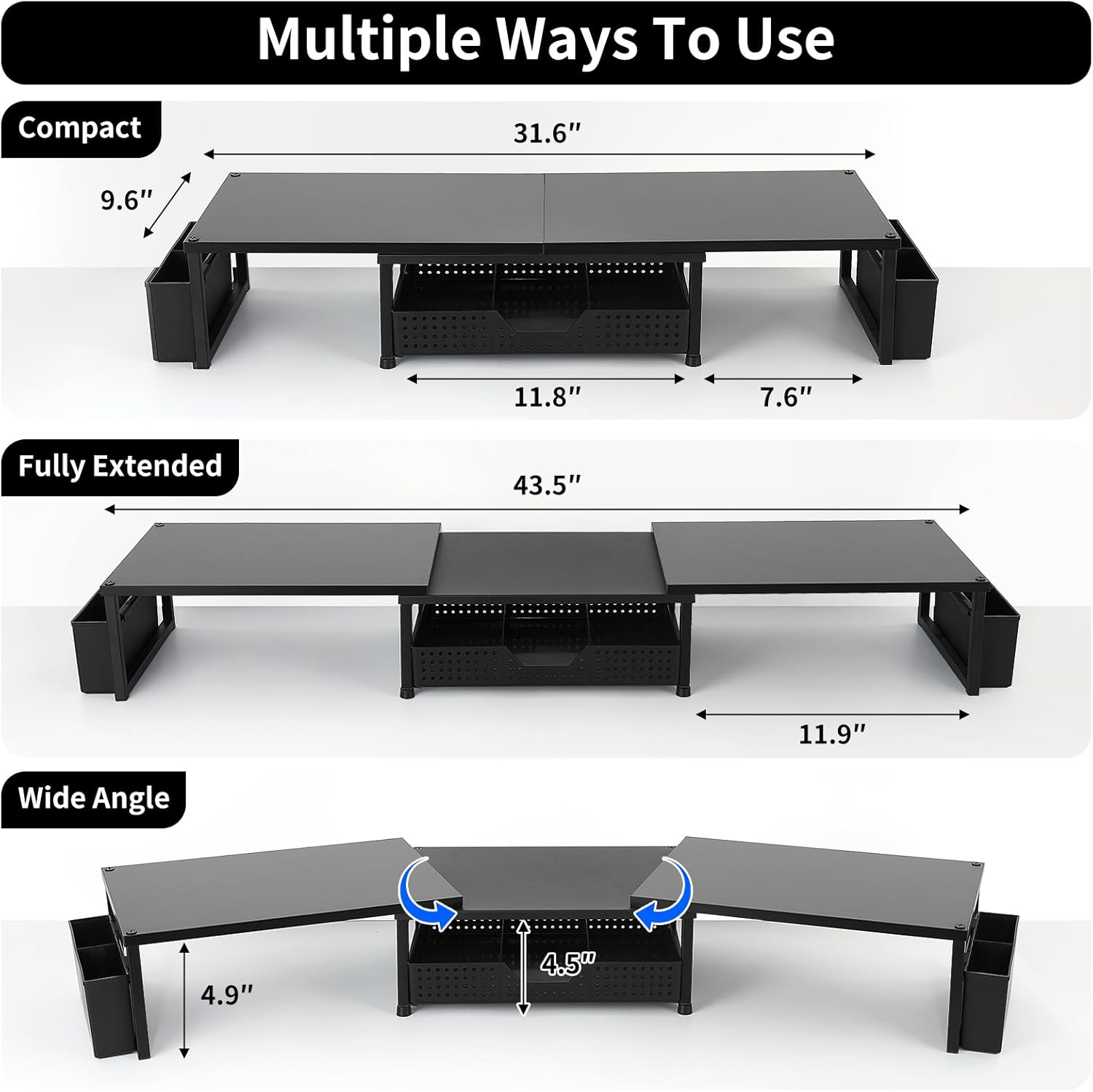 - Three Configuration Modes: The desk shelf for monitor provides three options: compact mode, full display mode, and wide-angle mode. You can freely adjust the angle and width of the stand according to your preferences to meet the needs of different work scenarios