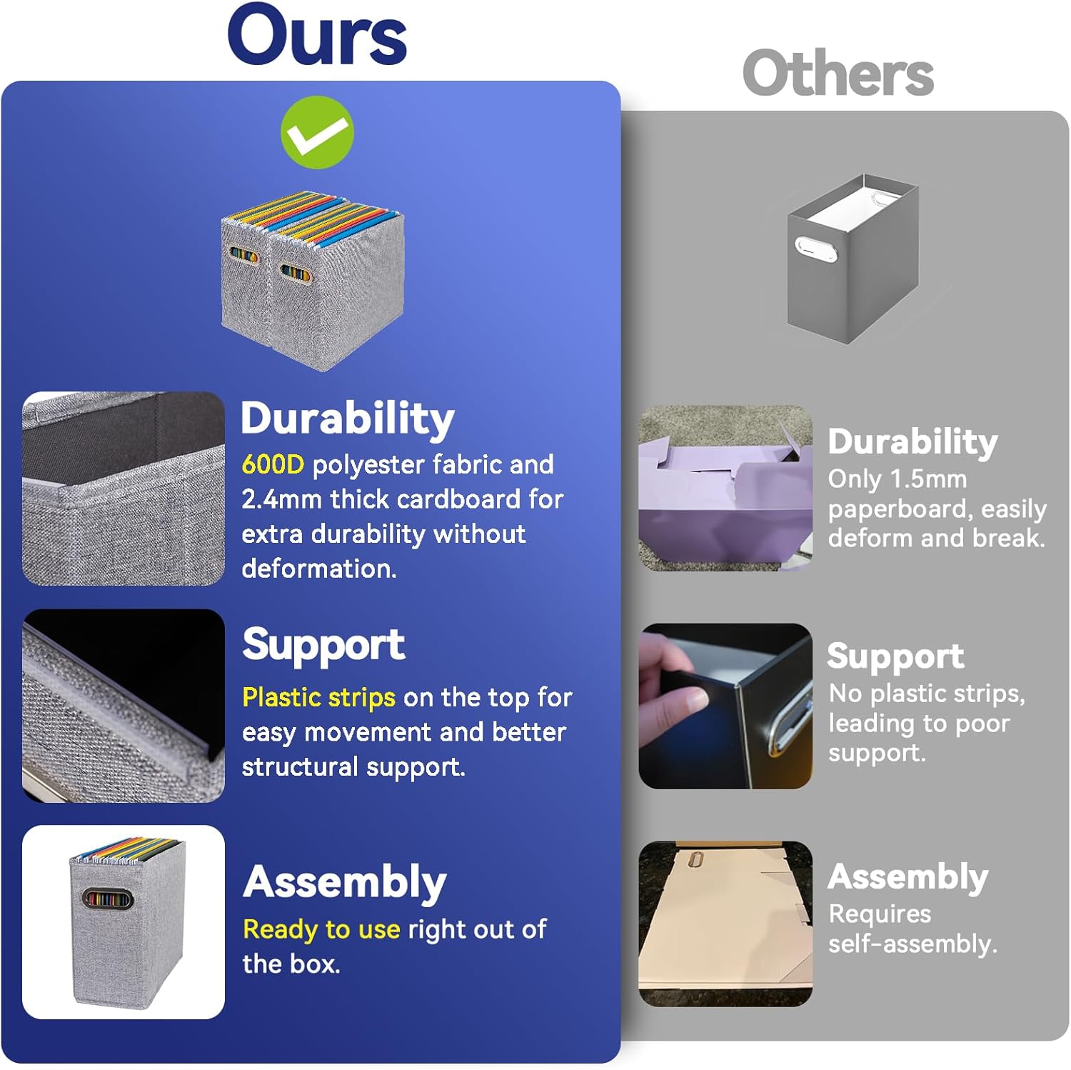- Easy to Assemble: Simply unfold the organizer, insert the thickened bottom panel, and it's ready to use in just 10 seconds. When not in use, it can be folded flat to save space. The open-top design allows for quick and easy access to your files, improving efficiency