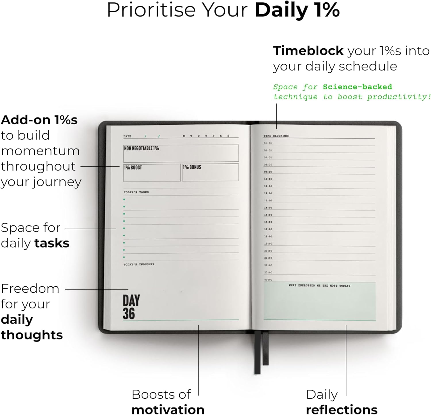 - The Power of the 1% Mindset As Shared on The Diary of a CEO by Steven Bartlett: The 1% mindset, made famous by Steven Bartlett on The Diary of a CEO podcast, is about committing to small, daily improvements that compound over time. This mindset shifts your focus from chasing drastic changes to embracing consistency. This self improvement journal teaches you to sweat the small stuff, because it's the 1% wins that shape lasting success.