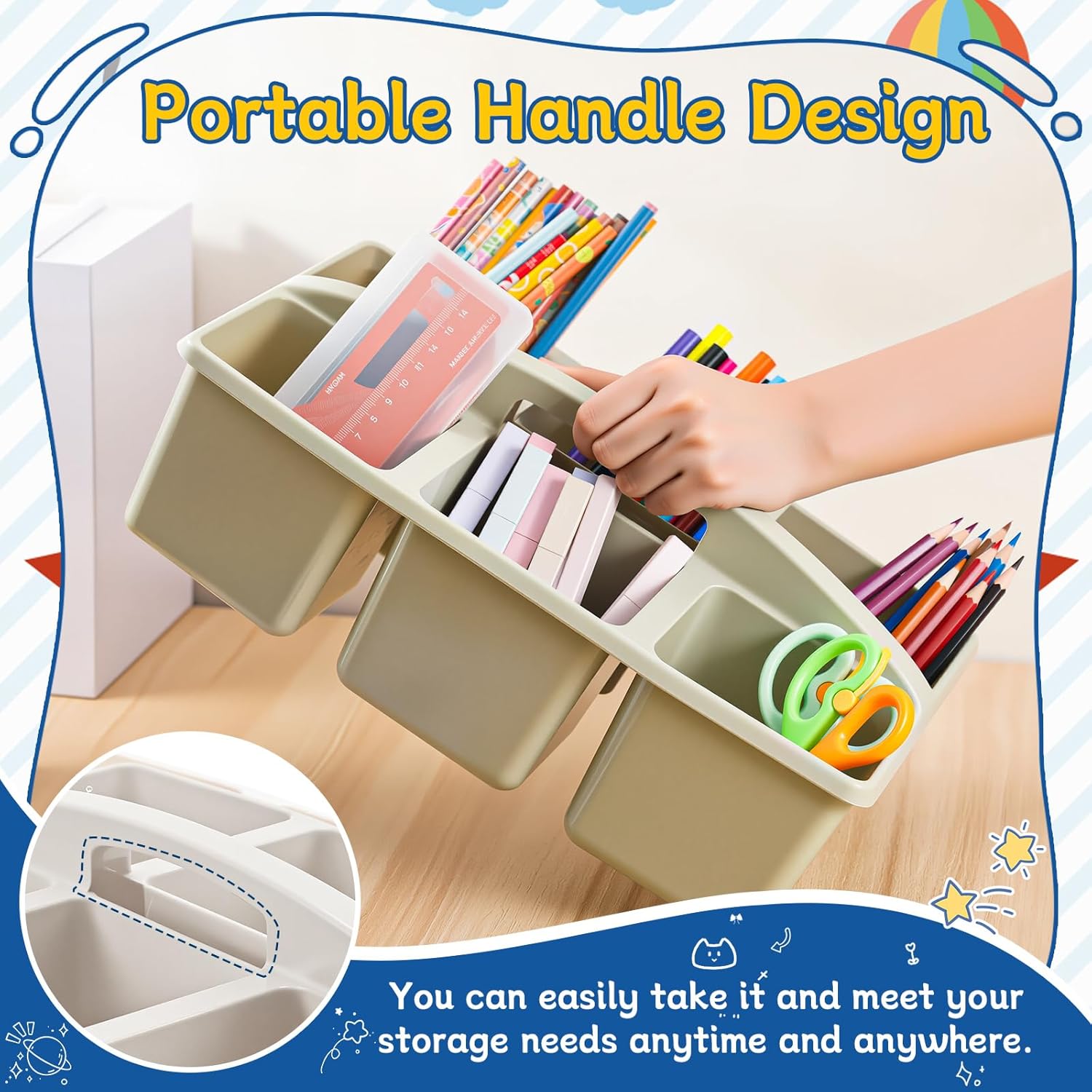 - Quality Materials: crafted from quality plastic, this caddy organizer with handle stands up to everyday classroom use; It combines functionality with affordable pricing, ensuring it withstands the rigors of frequent handling by students or family members