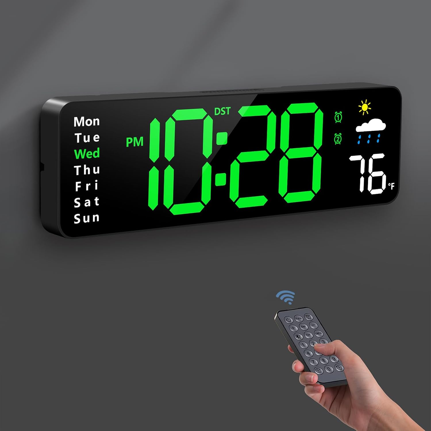 Digital Wall Clock, Digital Clock Large Display with Remote Control, Corded LED Alarm Clocks with Date, Week, Temp, Humidity, Auto DST, Countdown, for Living Room Bedroom Classroom Office (Green)