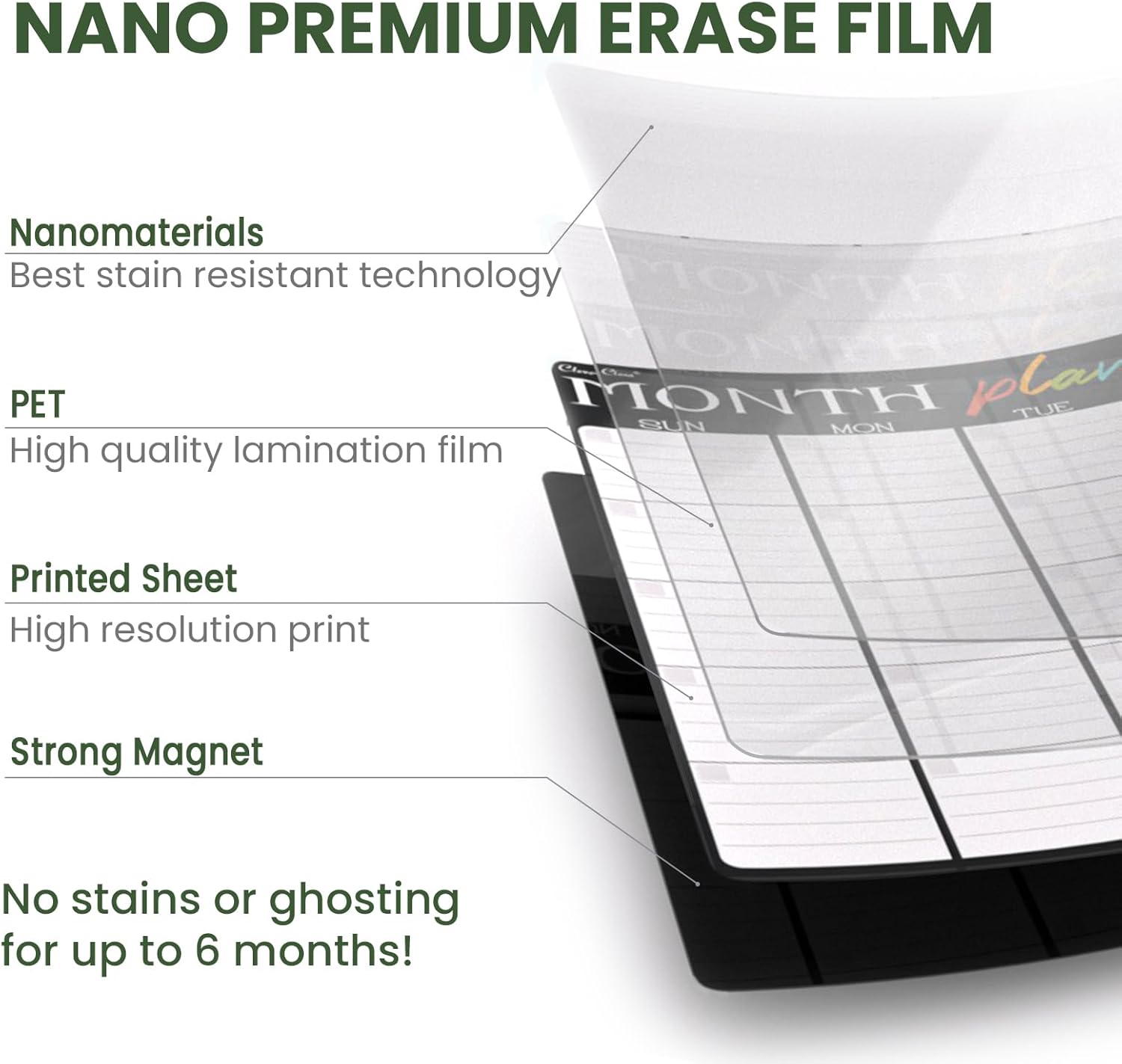 - Erases easily - Our calendars use premium nano erase film, making it incredibly easy to wipe off notes, even those that have been written for a long time. No residue, no fuss.