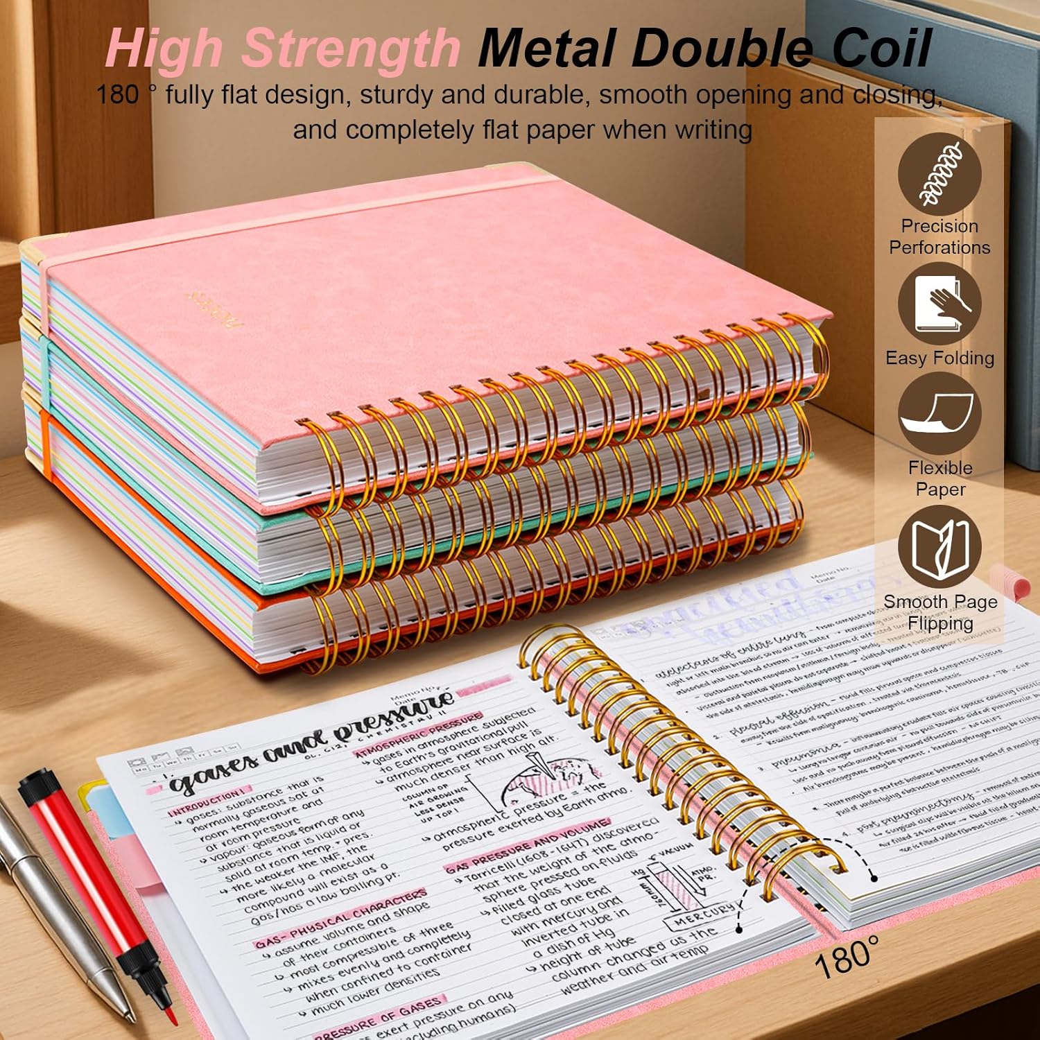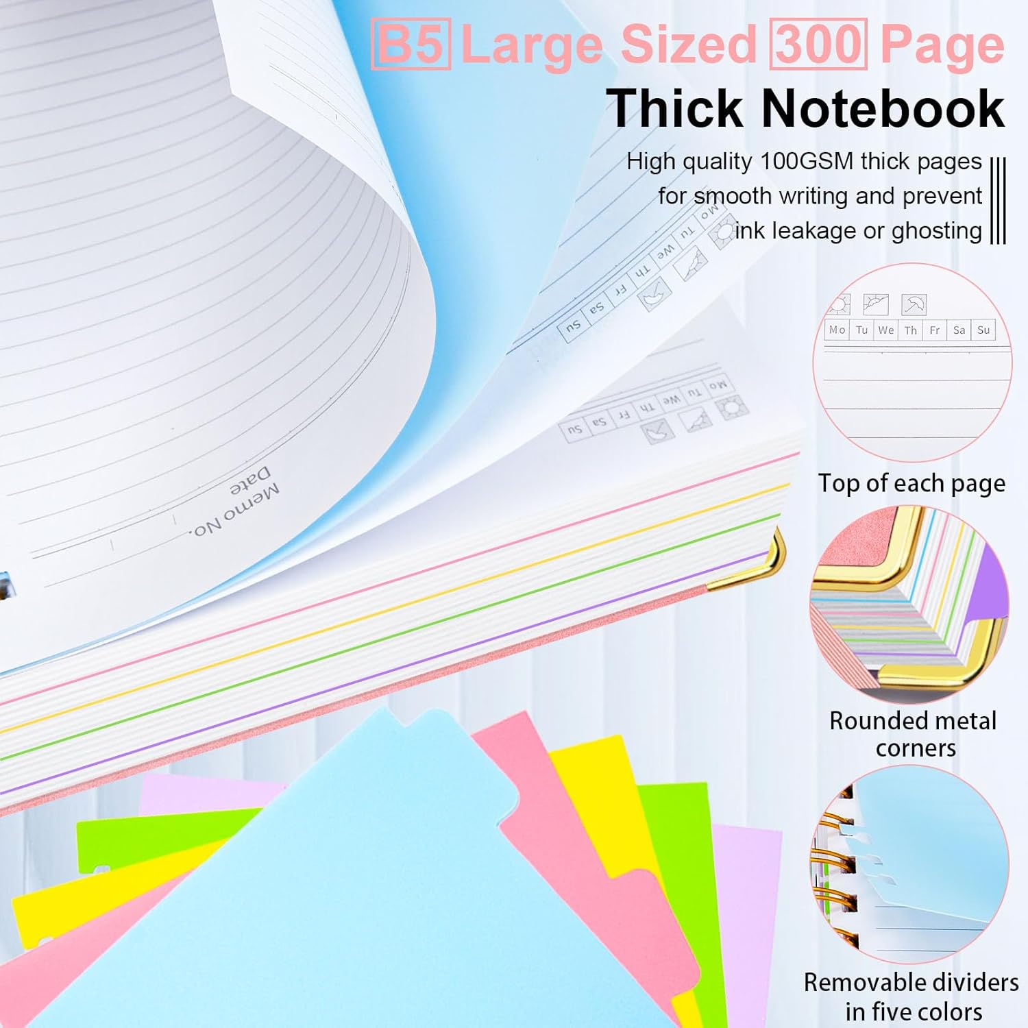 - 300 pages thick notebook:This college ruled spiral notebook features 300 pages of thick paper that resists ink bleed and ghosting. The spacious B5 layout (8"x10") makes it perfect for long-term planning, study notes, and personal journaling—less bulk, more value.