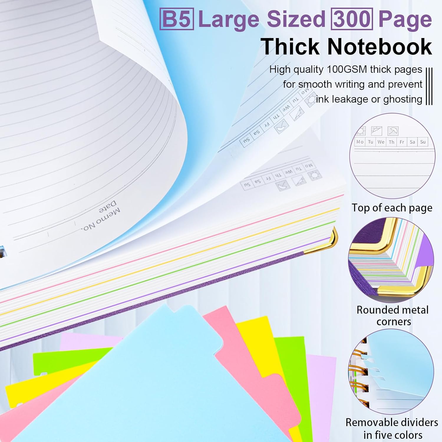 - 300 pages thick notebook:This college ruled spiral notebook features 300 pages of thick paper that resists ink bleed and ghosting. The spacious B5 layout (8"x10") makes it perfect for long-term planning, study notes, and personal journaling—less bulk, more value.