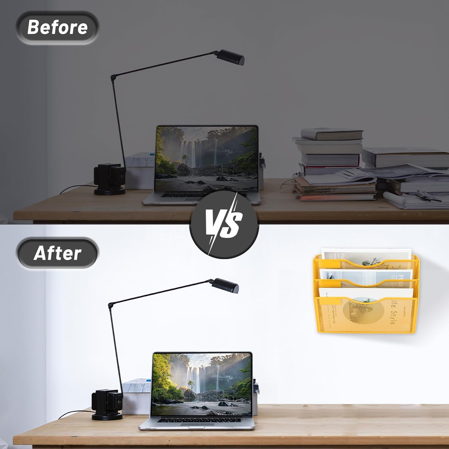 EASEPRES 3 Pocket Mesh Hanging Wall File Organizer, Wall Mounted Mail Paper Document Folder Holder, Clipboard Storage Organization Magazine Rack with Nametag Label for Office Home School, Yellow
