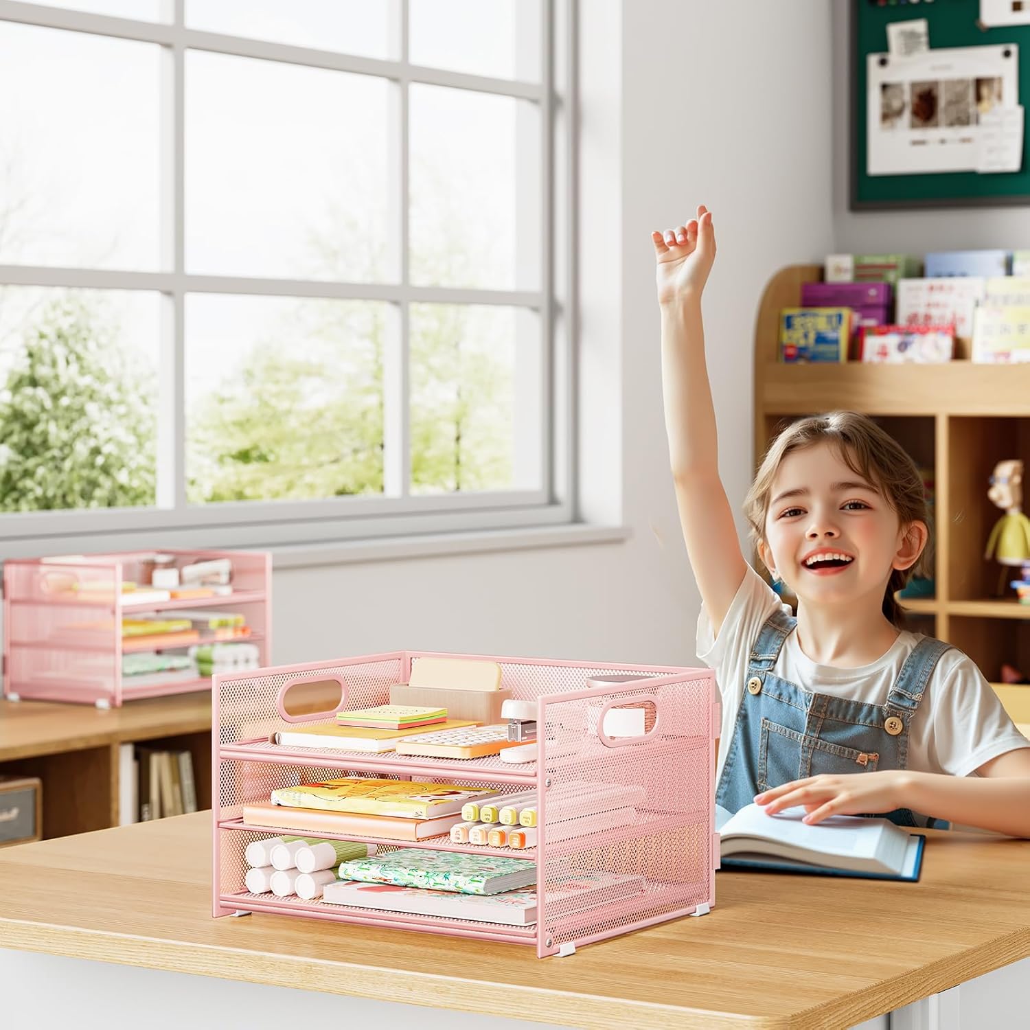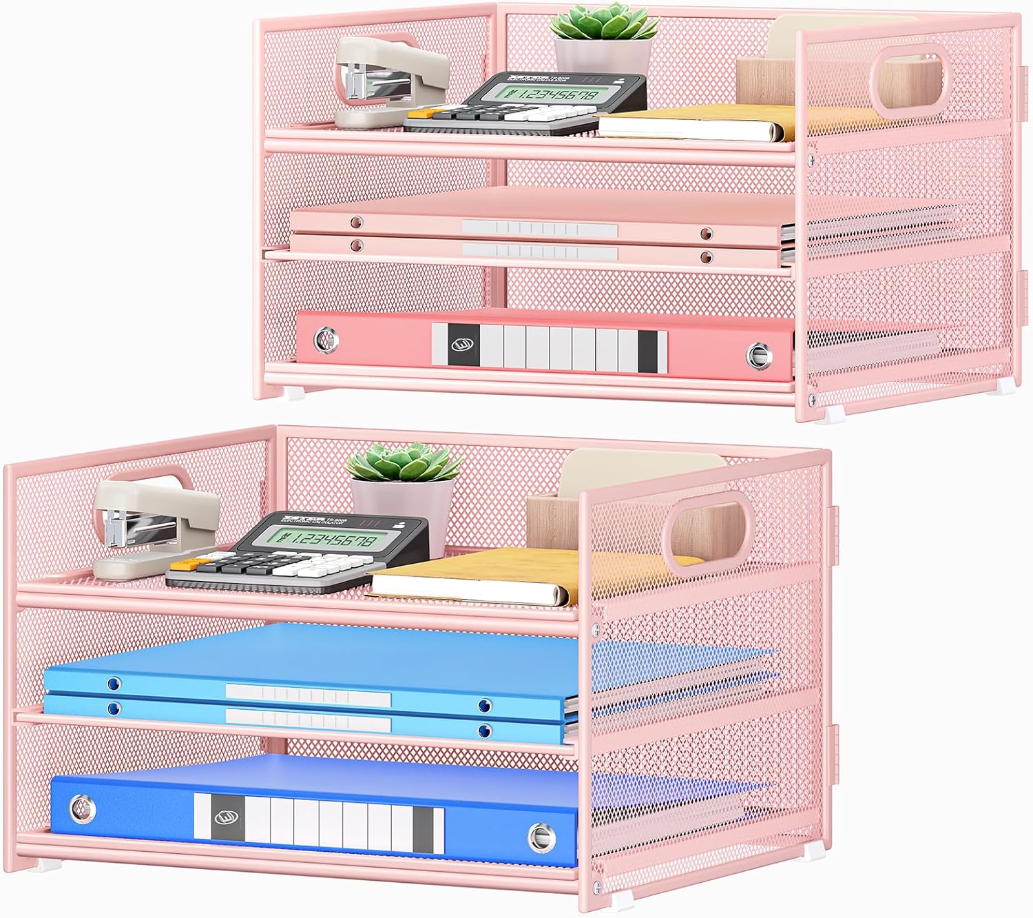 Subekyu 2-Pack 3-Tier Pink Metal Mesh Desk Paper Letter Tray & File Sorter Organizer with Handle + 1 Sliding Tray for Desk, Home, Office, School Supplies, A4 Paper and Accessories Storage