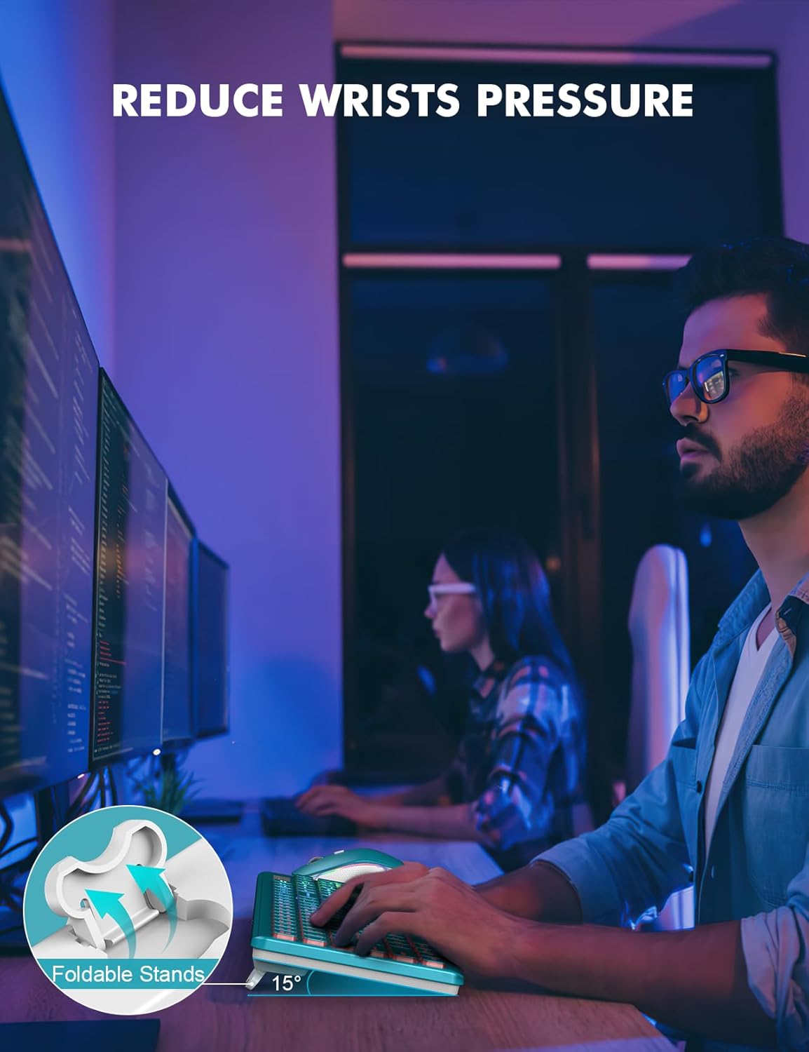 - COMFORTABLE TYPING & SILENT CLICK - The foldable stands offer a tilt angle for a better typing position. The effortless crater mechanism under each key makes typing more comfortable. The mouse and keyboard are almost silent, don't worry about disturbing others.