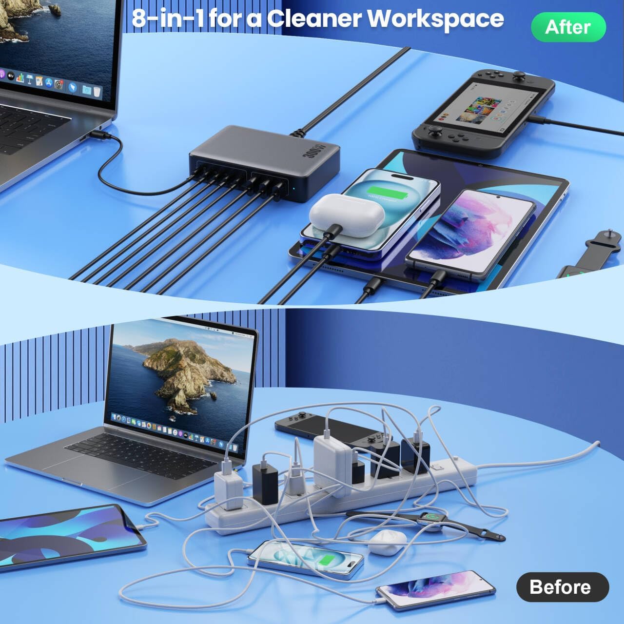 - 【300W Super Fast 8-in-1 Usb C Charger Block】Our USB charger provides multi charging options to meet your different needs. With 5*USB C ports and 3*USB A ports, no need for more adapters, you can use just one outlet to plug in laptops, tablets, smartphones, Bluetooth speakers and other small gadgets like earbuds, smartwatches, game consoles etc.Our USB C charging stations feature 8 independent output ports, ensuring all devices can charge simultaneously at full speed without power sharing and disconnection,this 8-in-1 charging station will reduce your accessories burden and help you create an organized and clean desktop.