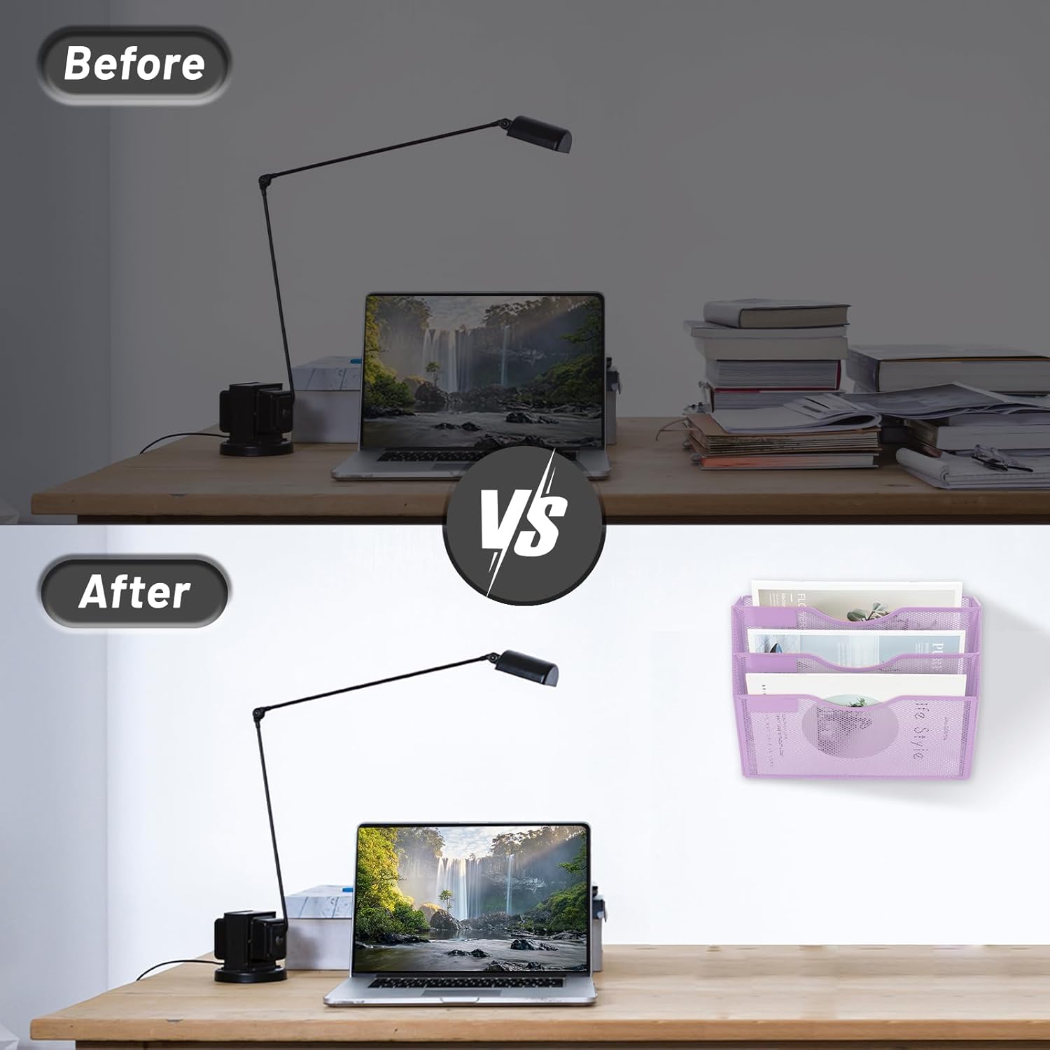 EASEPRES 3 Pocket Mesh Hanging Wall File Organizer, Wall Mounted Mail Paper Document Folder Holder, Clipboard Storage Organization Magazine Rack with Nametag Label for Office Home School, Light Purple