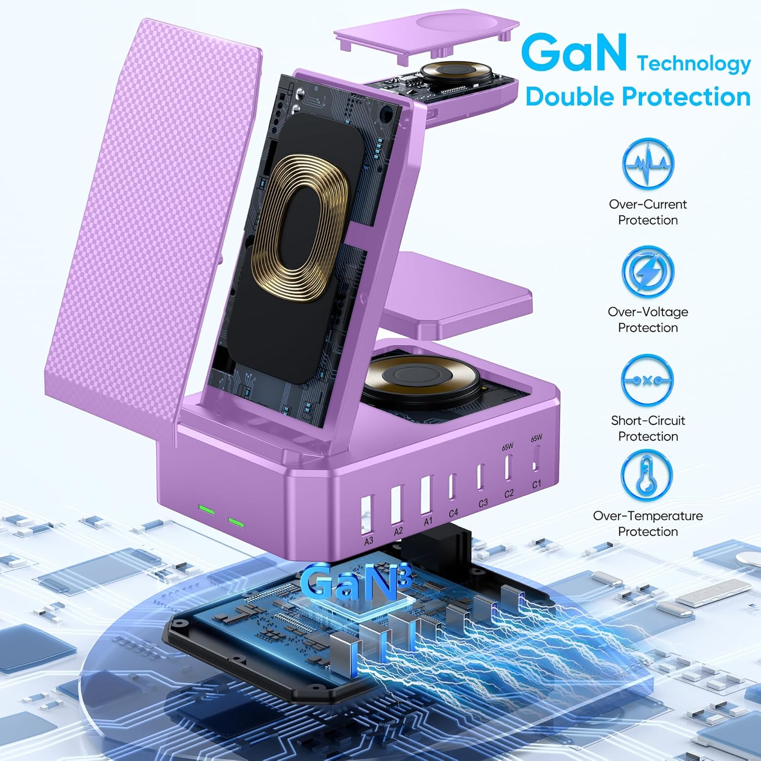 - ă65W Fast Charger Stand Dockă: Our Dual 65W PD Fast Charging Dock is equipped with the latest intelligent and efficient chipset with GaN III technology to ensure fast and safe powering of your devices. Ready to charge your Macbook series and other laptops. Our desk usb charging dock features over-current, over-voltage, over-temperature and over-charging protection. The internal circuitry is designed to prevent overcharging from damaging your device, ensuring safe charging.