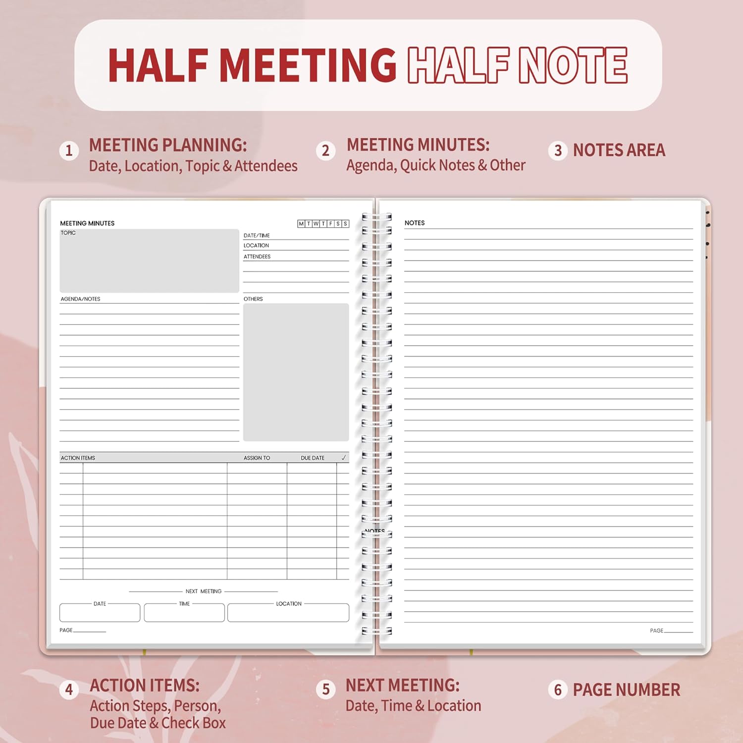 - Half Meeting Half Note: 1.MEETING PLANNING: Date, Location, Topic & Attendees 2.MEETING MINUTES: Agenda, Quick Notes & Other 3.NOTES AREA: Lined Page 4.ACTION ITEMS: Action Steps, Person, Due Date & Check Box 5.NEXT MEETING: Date, Time & Location 6.INDEX PAGE: Date, Title, Page Number, which will help create more effective meetings and good results.