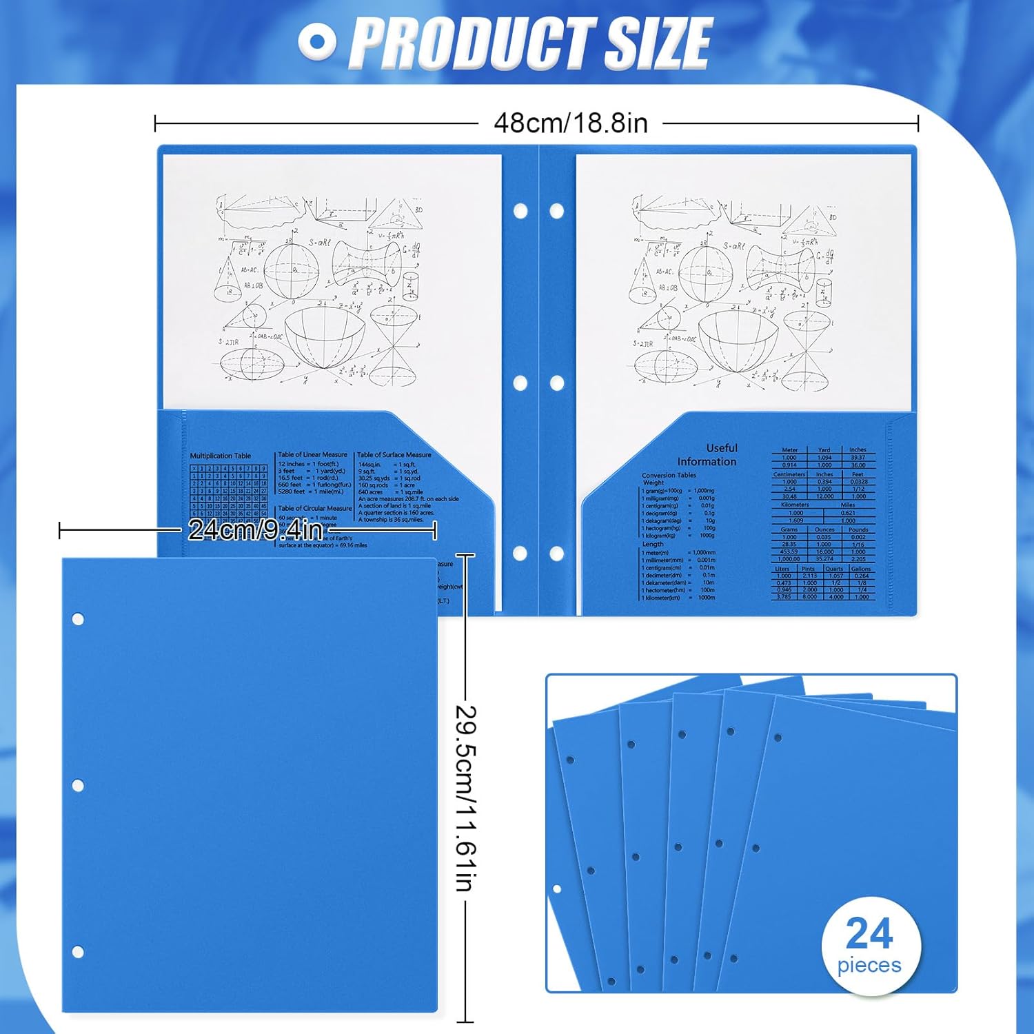 - Enough Quantity for Use and Replacement: you will receive 24 plastic pocket folders, each folder has 3 holes and 2 inside pockets, each folder pocket contains creative designed calculation conversion tables, help you quickly solve simple math problems; Can hold 3 binders and 8.5 X 11 inch letter-sized paper, each pocket can easily and neatly stack 50 pages of letter-sized paper