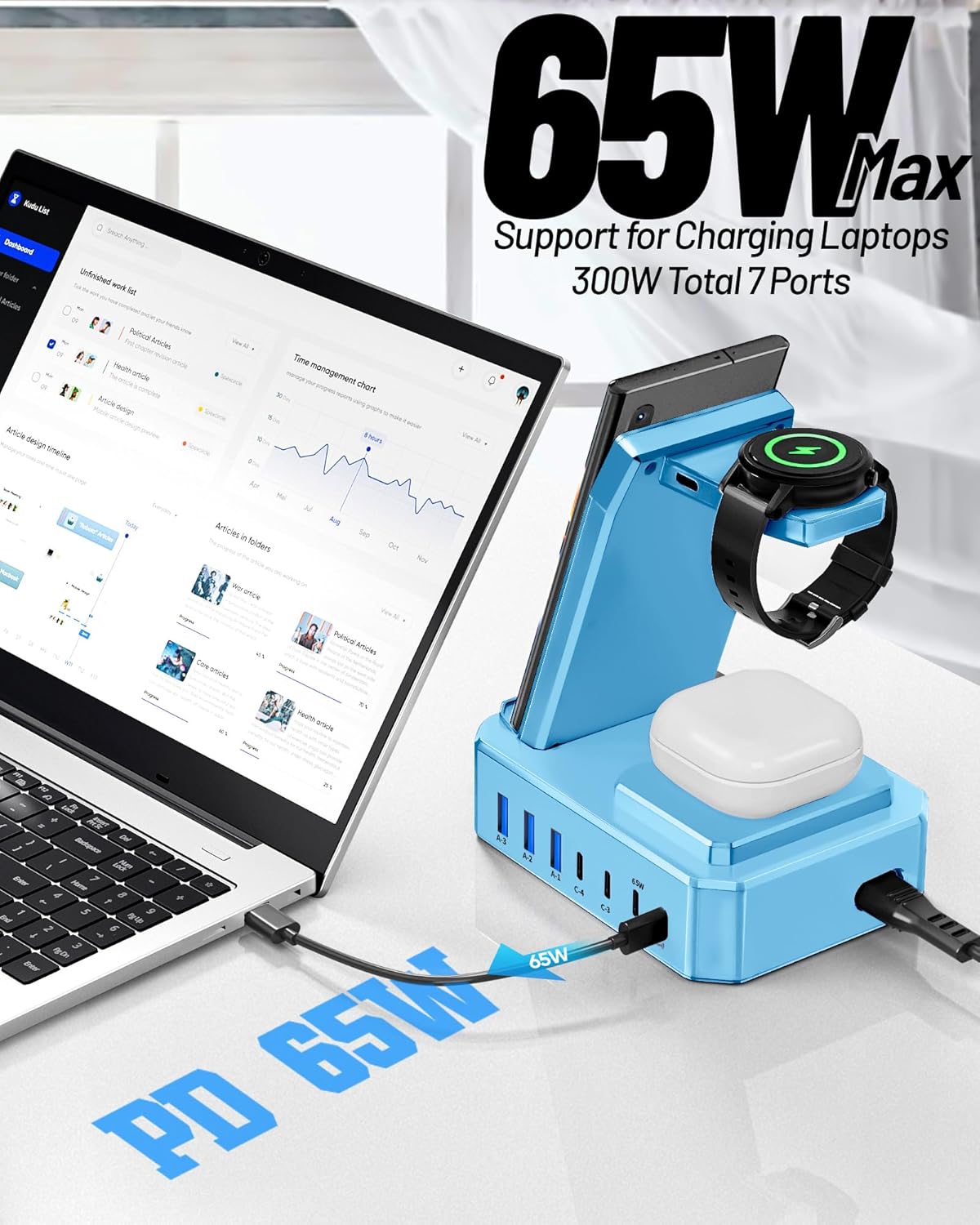- ă300W Charging Station for Multiple Devicesă: Charges up to 10 devices simultaneously.This desktop phone charging station is the perfect solution for charging multiple devices! Our charger station features 2 powerful 65W USB-C ports designed specifically for charging laptops, 2 efficient 30W USB-C ports and 3 versatile 30W USB-A ports . Samsung wireless charging station total output can be up to 300W. You can conveniently fast charge your samsung devices and other devices at the same time.