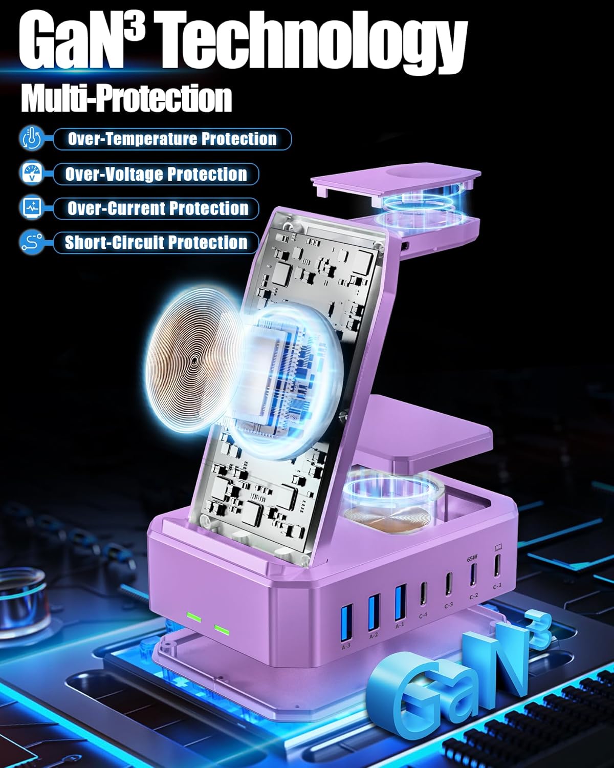 - ăSafe Charging&Multiple Protectionă: Our Dual 65W PD usb c fast charger dock is equipped with the latest intelligent and efficient chipset with GaN III technology to ensure fast and safe powering of your devices. Ready to charge your Macbook series and other laptops. Our phone and watch charging station features over-current, over-voltage, over-temperature and over-charging protection. The internal circuitry is designed to prevent overcharging from damaging your device, ensuring safe charging.