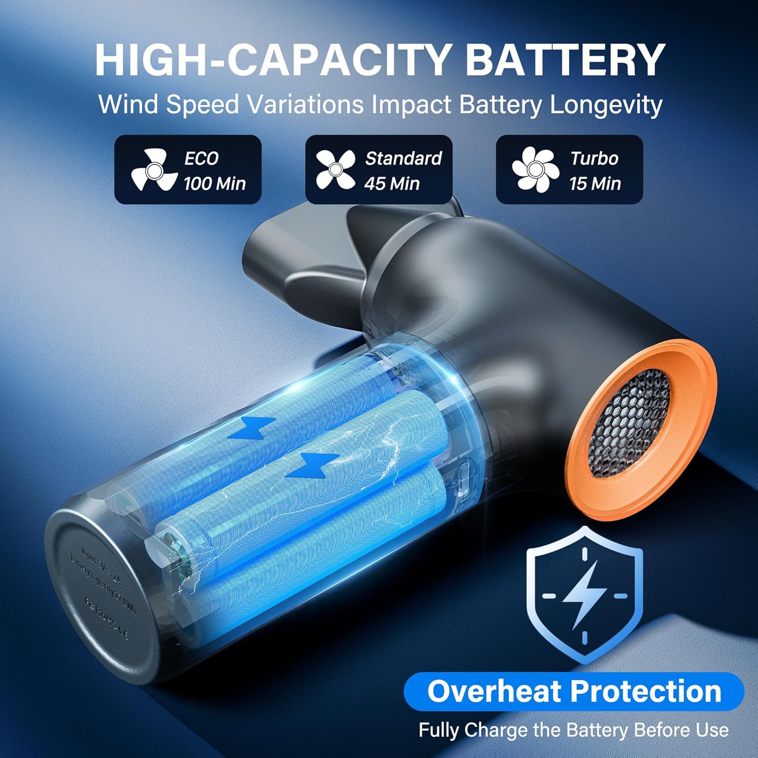 - 【Intelligent Safety & Ergonomic Grip】Designed for comfort with a non-slip grip, this mini blower is for electronics and easy to store. Use Tip: Fully charge before first use; press 3 seconds to power on/off. Perfect for compressed air dusters replacements!