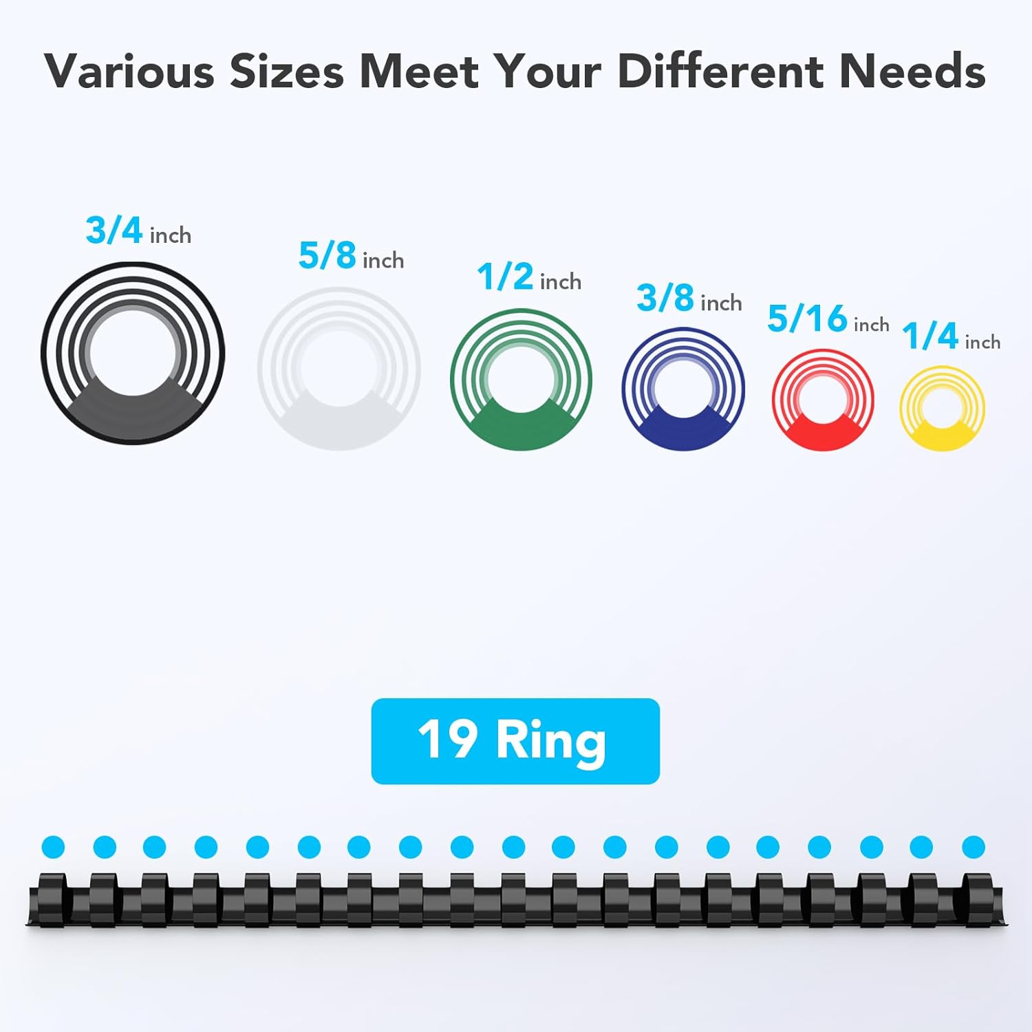 - Available in 6 sizes and 6 colors including 1/4", 5/16", 3/8", 1/2", 5/8", 3/4" to match the internal reports or functional documents; Spine Type: comb; Package Contain: Pack of 150(about 25PCS per size)