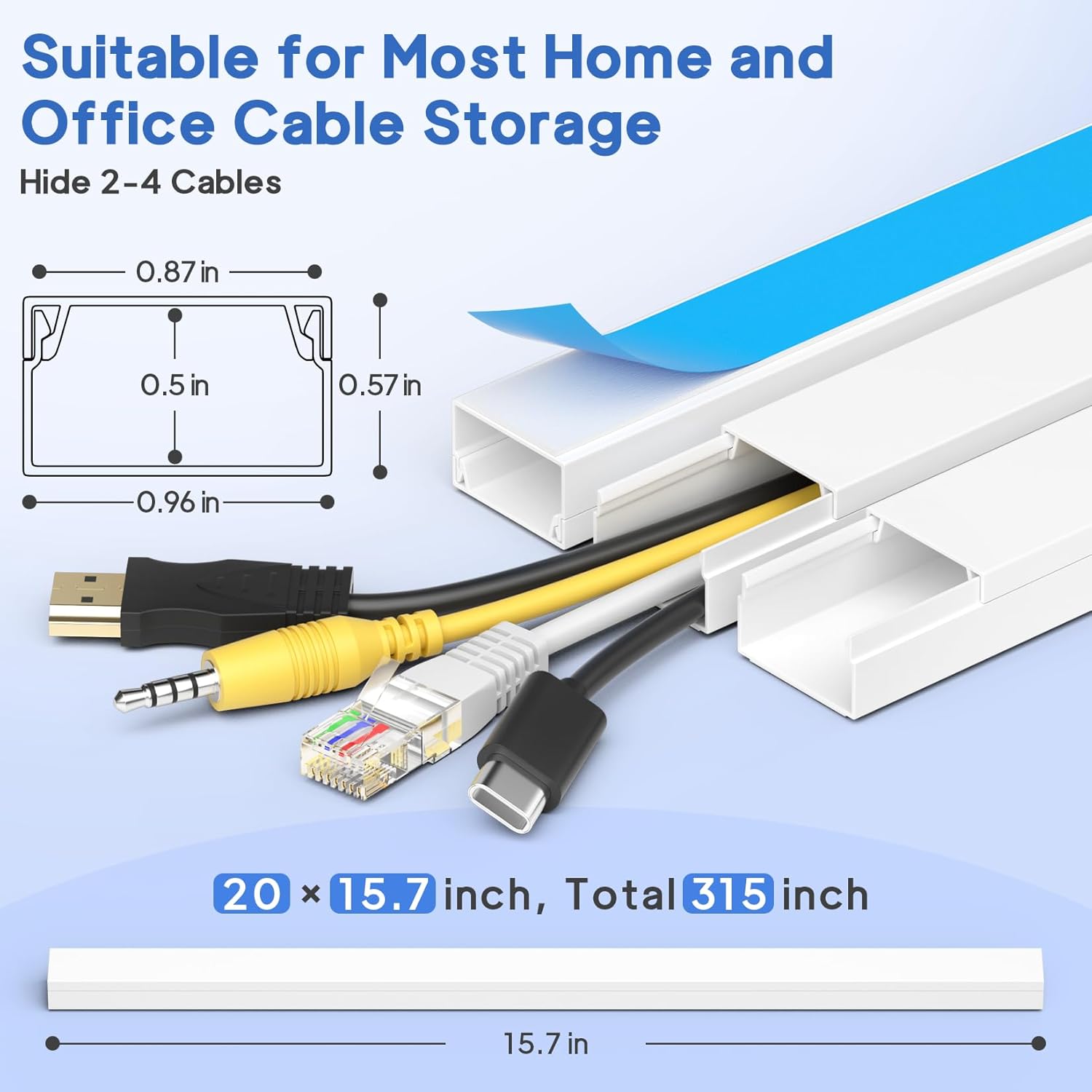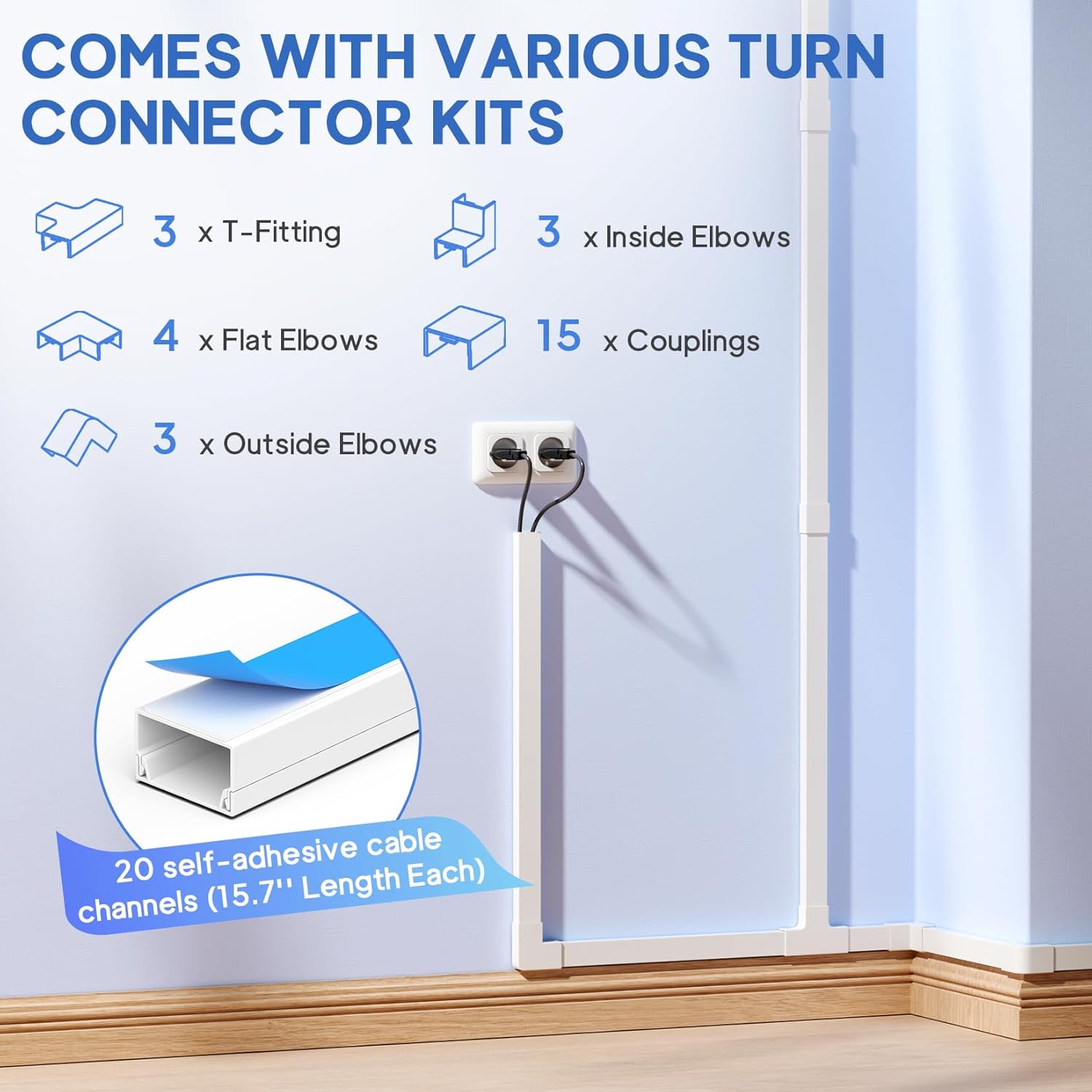 - Complete Kit Content: Each cable raceway measures 0.57" inner height × 0.96" inner width × 15.7" length, with a total coverage of 315". The set includes 20 cord hiders, 15 couplings, 4 flat-elbows, 3 T-fittings, 3 inside elbows, 3 outside elbows, and 1 instruction guide—everything you need for full cable concealment.