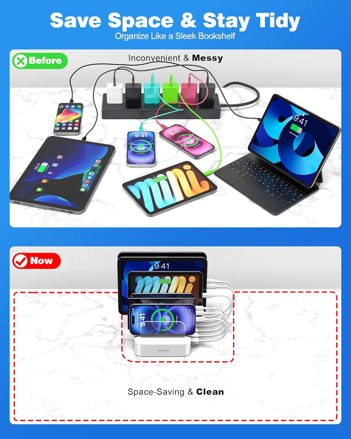 - 【Practical for Daily Use, Perfect for Gifting - Trusted by 1M+ Users】MSTJRY’s iPad charging station is more than just a charger - it’s a versatile, space-saving solution trusted by over 1 million users. Whether you're organizing devices at home, in the office, at school, or even in restaurants and cafés that rely on multiple iPads for customer service, it helps keep every space neat, organized, and fully powered. And it also makes a thoughtful gift for family, friends, teachers, or coworkers.