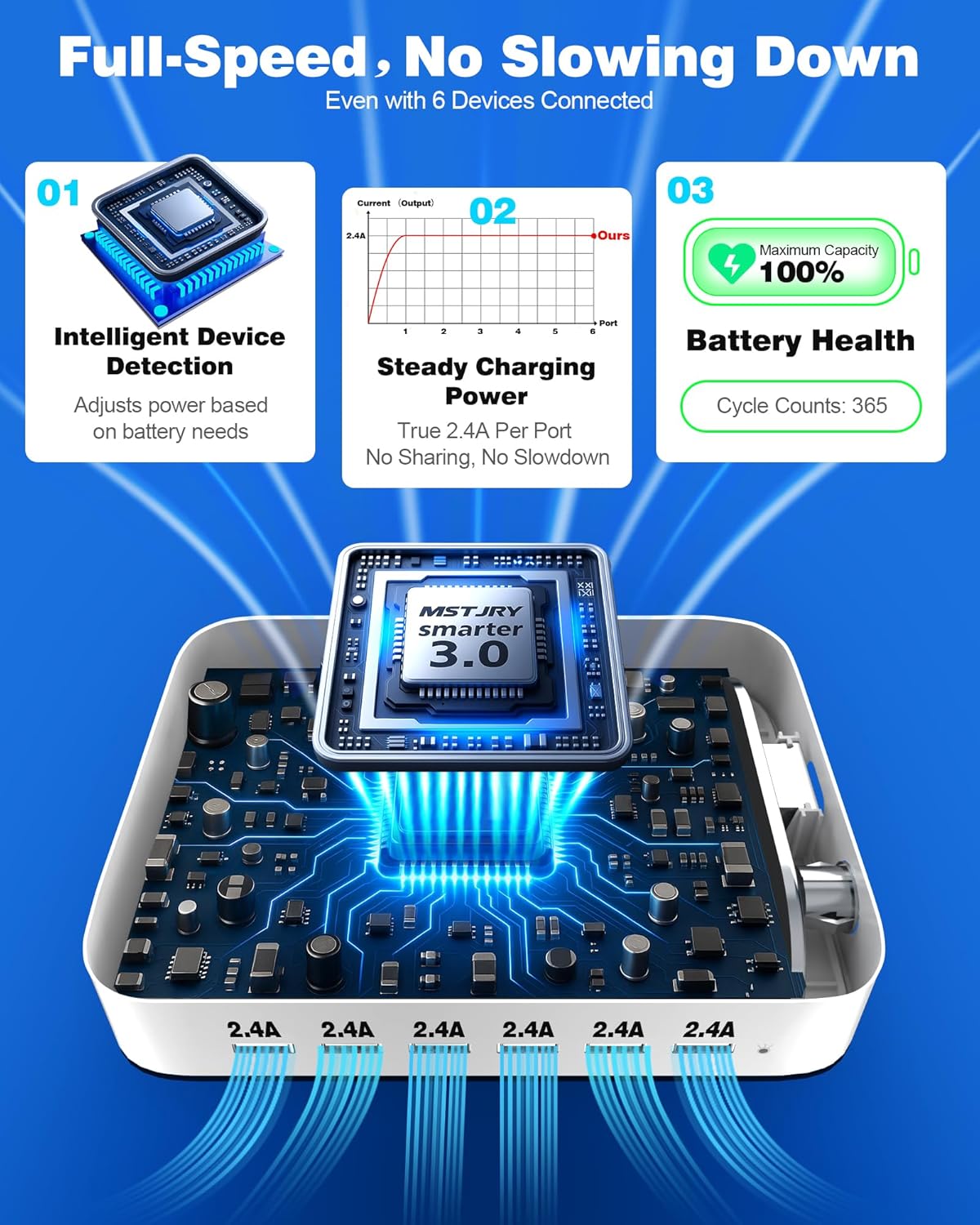 - 【Full-Speed Charging, Even with 6 Devices - Powered by Smart Chip 】No more slowdowns just because you're charging more. MSTJRY’s advanced Smart-chip ensures every device gets a full stable 2.4A output - whether you're charging one phone or powering a whole family's devices at once. It intelligently adapts to each battery's needs, helping protect battery life while keeping charging fast and steady. One charging dock, always fast, always steady - no matter how many devices.