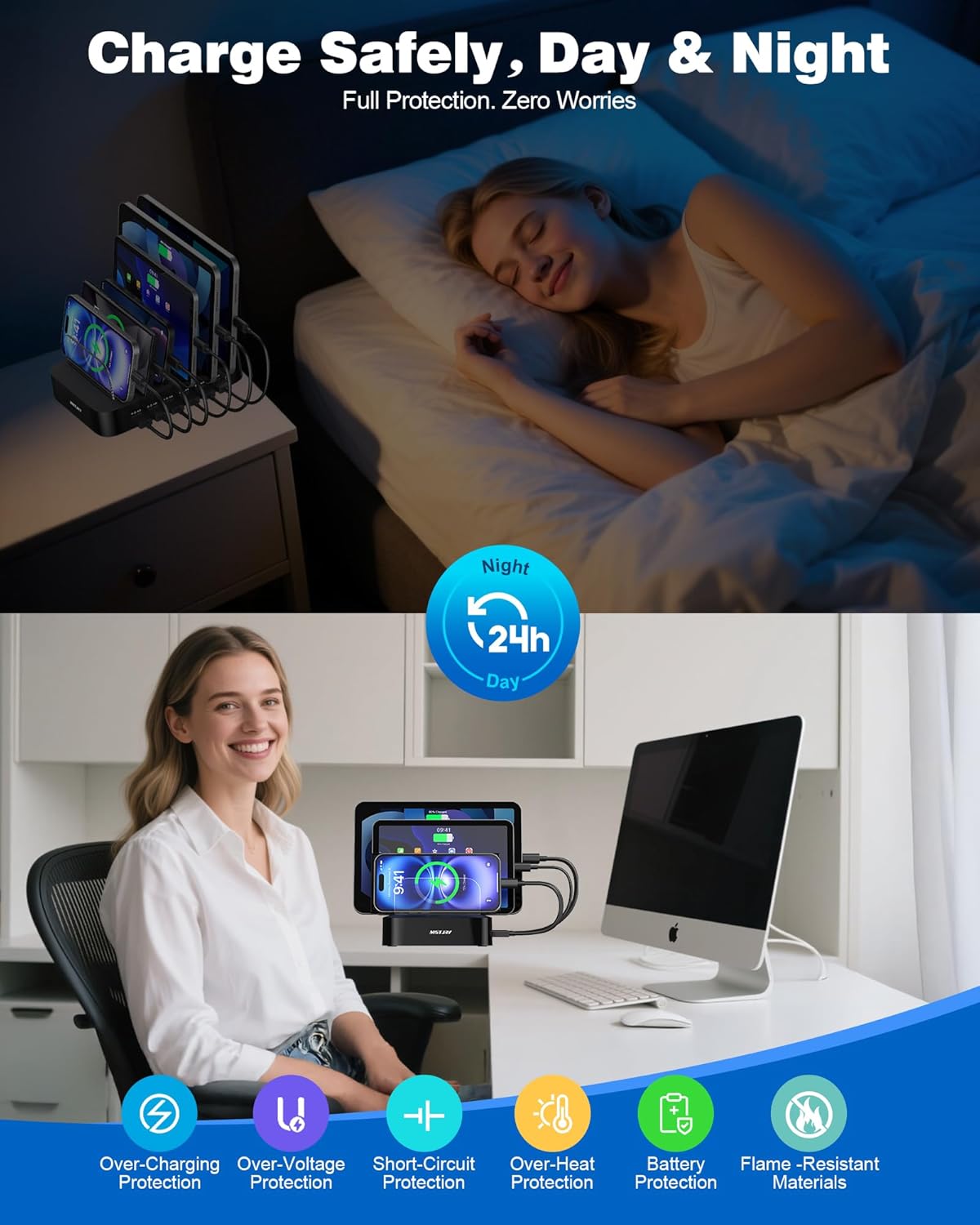 - 【Safety-First Design - For Worry-Free, Everyday Charging】Crafted with a flame-retardant ABS casing and soft anti-slip pads, this Phone charging station delivers stable, secure charging day after day. Built-in safeguards protected your devices from overheating, overvoltage, overcharge, and short circuits - 24/7. A dedicated power switch gives you quick, safe control. From busy homes to office desks, every detail is made to make charging safer and more dependable.