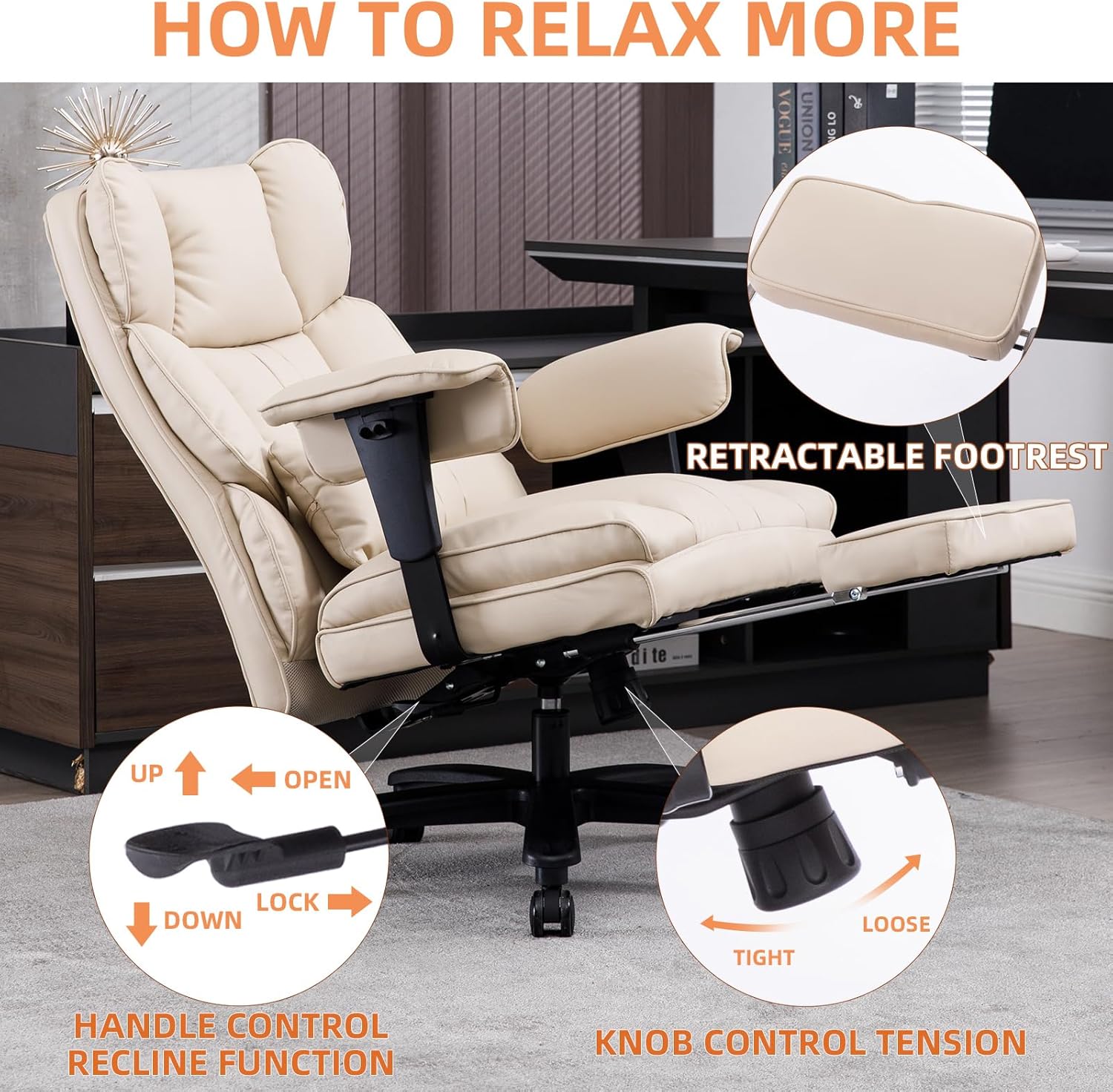- ๐บ๐๐๐๐๐: Leather office chair built on a foundation of durability. Heavy-duty metal base and SGS-certified 4-Grade lift cylinder ensure not only steadfast executive chair with leg rest stability but also peace of mind with big and tall office chair every adjustment.