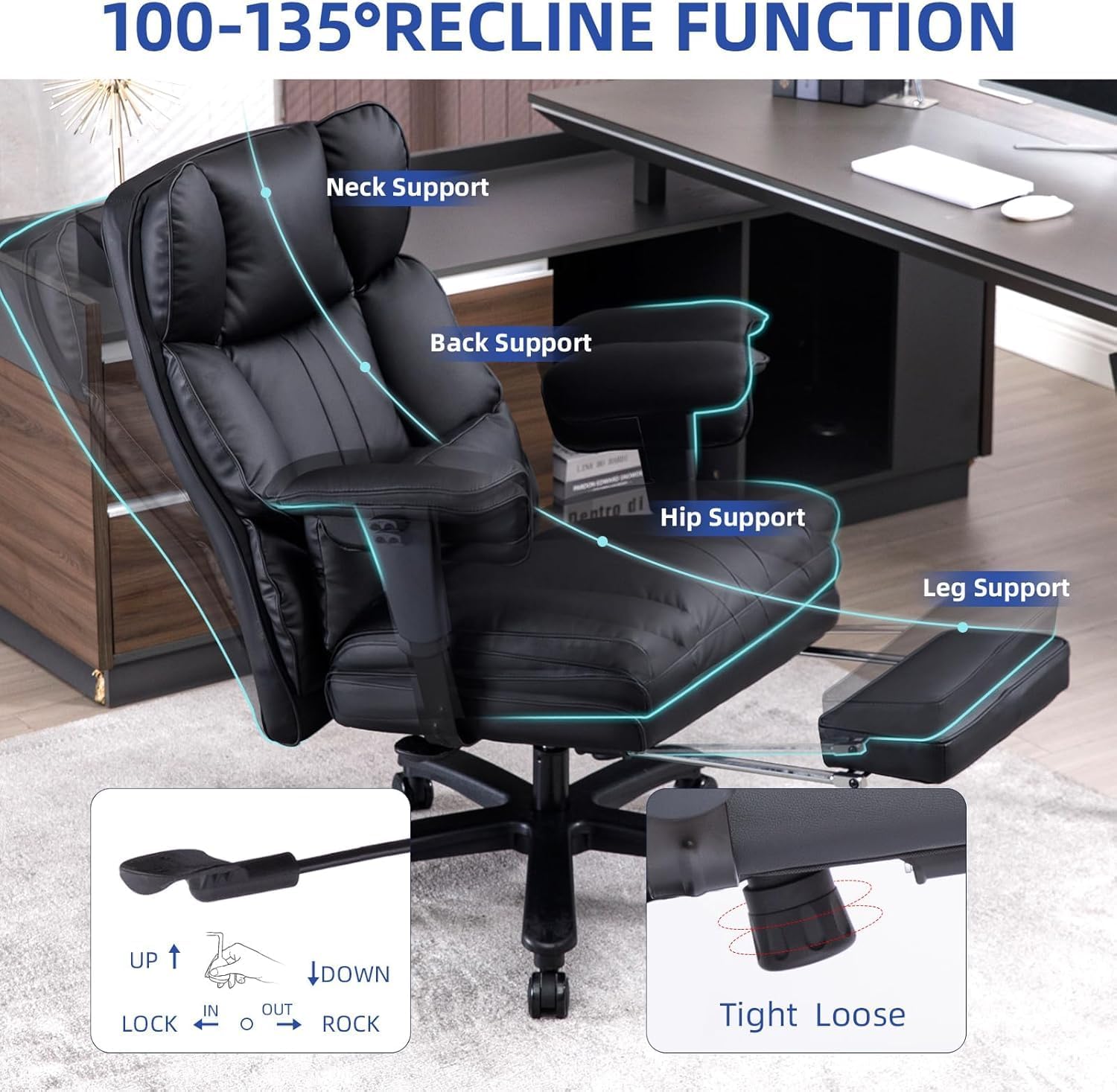 - ๐บ๐๐๐๐๐: Leather office chair built on a foundation of durability. Heavy-duty metal base and SGS-certified 4-Grade lift cylinder ensure not only steadfast executive chair with leg rest stability but also peace of mind with big and tall office chair every adjustment.