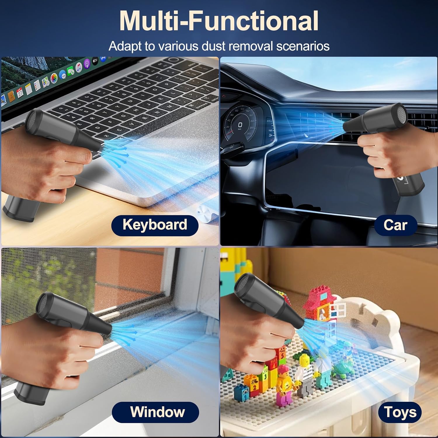 - 【Powerful Performance】The air duster collector can reach a speed of up to 180,000 RPM, efficiently removing dust and other impurities. It features both three-speed regulation and stepless speed regulation modes, helping you customize the airflow according to different cleaning needs.