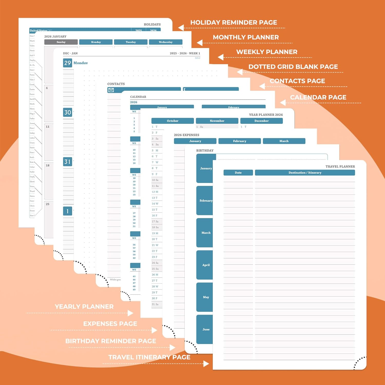 - Great Material for Weekly Planner: Crafted with FSC-100gsm thick paper that resists ink bleed and daily wear, this 2026 planner ensures smooth writing with markers while gentle on your eyes through its ivory white pages. The Vegan leather soft cover and reinforced lay-flat binding make it a calendar planner companion for busy professionals, students, and families