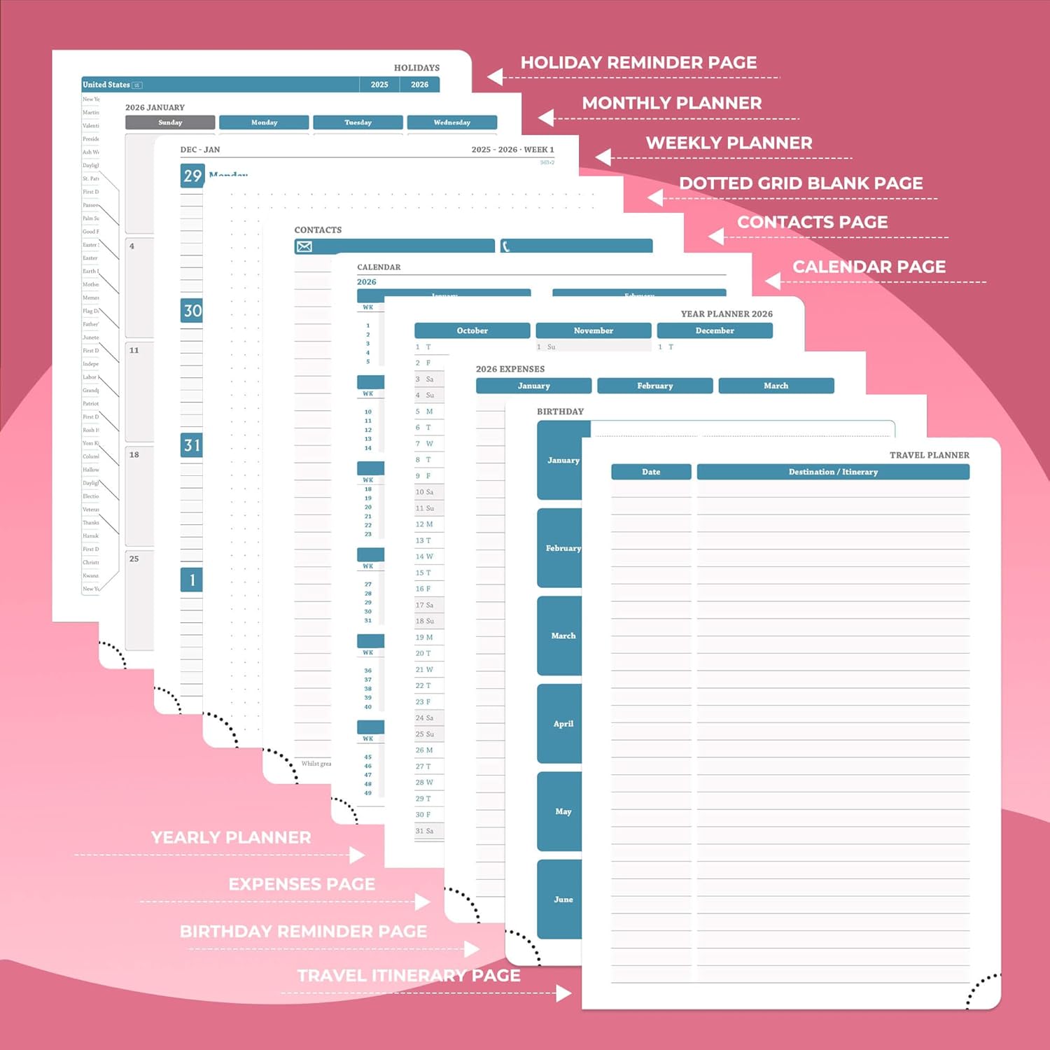 - Monthly Planner: Covers Jan.2026-Dec.2026. It adopts a double-page design for one week, so you can get a general overview without turning pages. The weekly planner page provides writing space for arrangement of daily tasks, priority management and activity records; the left side of the monthly plan marks important dates, and the right side plans special tasks